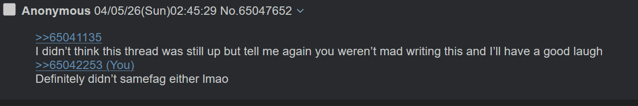 >>65041135I didn’t think this thread was still up but tell me again you weren’t mad writing this and I’ll have a good laugh>>65042253Definitely didn’t samefag either lmao