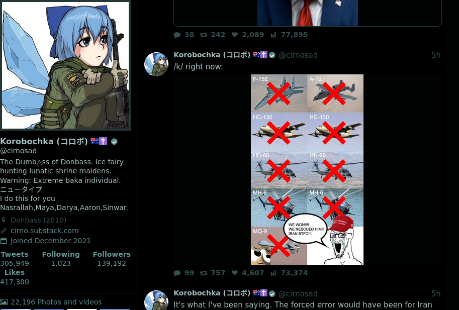 Just and FYI /k/:cirnosad is making FUN of you /k/, and I am glad he is doing it.https://xcancel.com/cirnosad/status/2040774715216986230#mhttps://x.com/cirnosad/status/2040774715216986230#m> /k/ right now:>[image of many completely destroyed aircraft with /k/ saying some bullshit like "where are the destroyed aircraft" (just like they say "where is the radiation", the reports of the Cesium 137 on september 17th 2024 is linked, along with /pol/ noticing the reports of the Cesium 137, and /k/ just repeating "NO RADIATION!!!")]I am GLAD cirnosad is making fun of you /k/