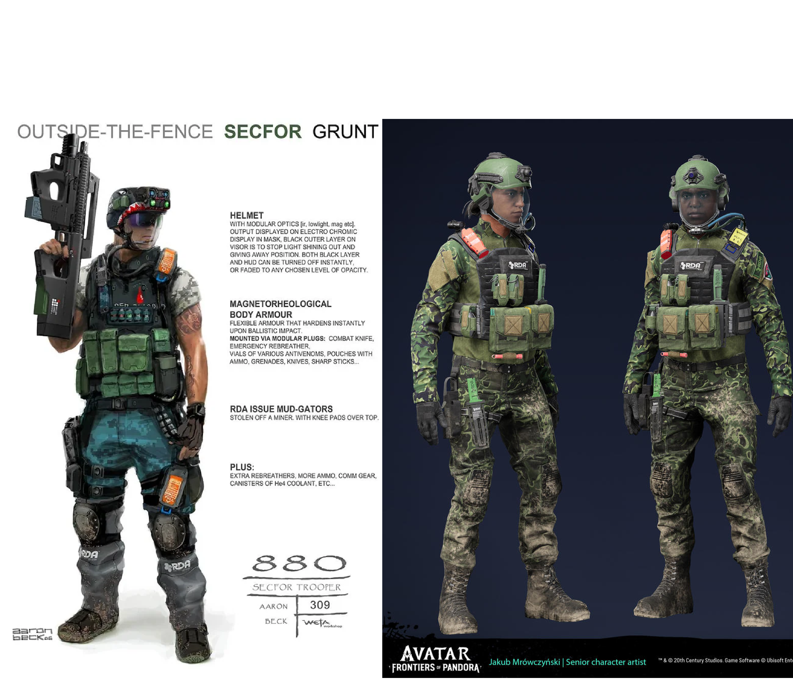 Hot take. I don't like the direction the RDA Uniforms went in after the first film.Starting off Avatar 1 uniform, It's obvious it took heavy inspiration from the GWOT. (both uniforms are products of their time). The surge was happening at the same time they were making the movie so, I suspect the media pics of Army regs is where they got their source material from.The Film has that bulky vest with a neck protector and lots of big pouches on the front which is reminiscent of an OTV. He's wearing sperate knee pads which was the height of tacticool back then and he's even got eye pro.That being said there's a lot of stuff which made the look more futuristic, at the time at least. The bullpup rifle (which supposedly fired caseless ammo) and GL combo gave a more distinct look than modern troops. IK at the time everybody thought that bullpups would be the future and turned out to be wrong but, I think that just serves to reinforce the point. That, despite looking dated now. The Avatar 2009 soldiers looked far more futuristic at the time the film came out.In contrast the Avatar 2/3 troops look way too contemporary. I know that /k/ommandos are generally in favor of realism but, this hits way too like you could just go outside and buy the same gear now.The camouflage pattern is Kino (even if they got it because digicam went out of vogue and Multicam is in) but, the actual uniform is a bit too vanilla. It's just generic Operator Crye combat shirt and pants. The carrier is way to basic, it's even got Molle webbing on it. The helmet is literally just a MICH 2001 with peltors and a generic looking NVG mount (they actually replaced the abstract ones from 2009 with generic modern ones). And last of all they replaced the Bullpup rifle with some XM8 clone - it even fires cased ammo.I just feel like when updating the uniforms and gear in Avatar 2 and 3 they got way too lazy and slopified it