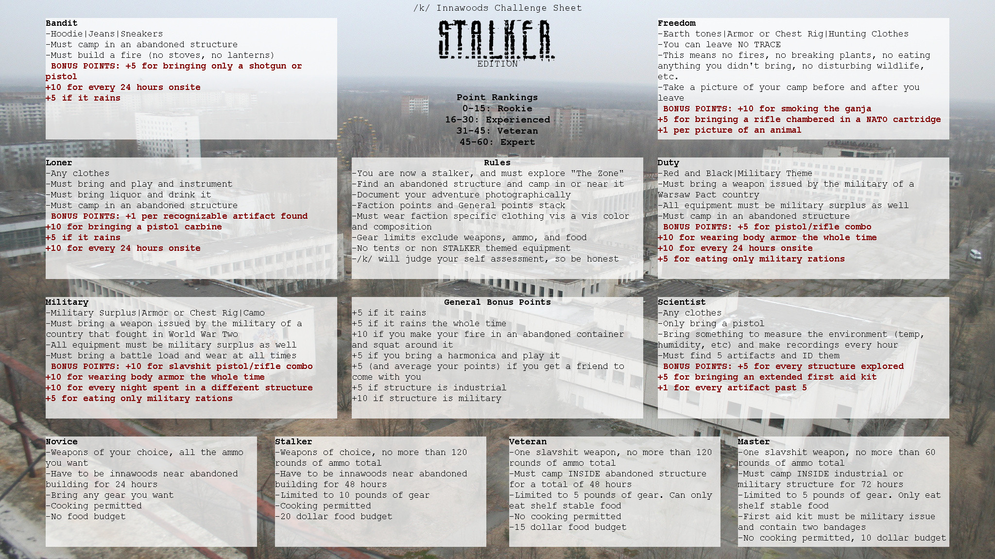 Restarting my favorite general. With the cold weather comes the time to larp as a survivor in the nuclear winter. You HAVE been spending time innawoods, haven’t you /k/? Innawoods, reenacting, and true stalking welcome.