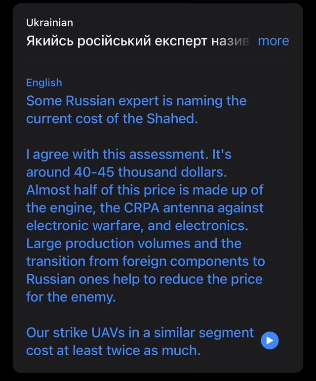 >>64755735>>64755499Ukrainian drone expert concurs with a Russian drone expert pegging the cost of a Geran at $40-45k and says their own FP-1 drone costs twice as much.