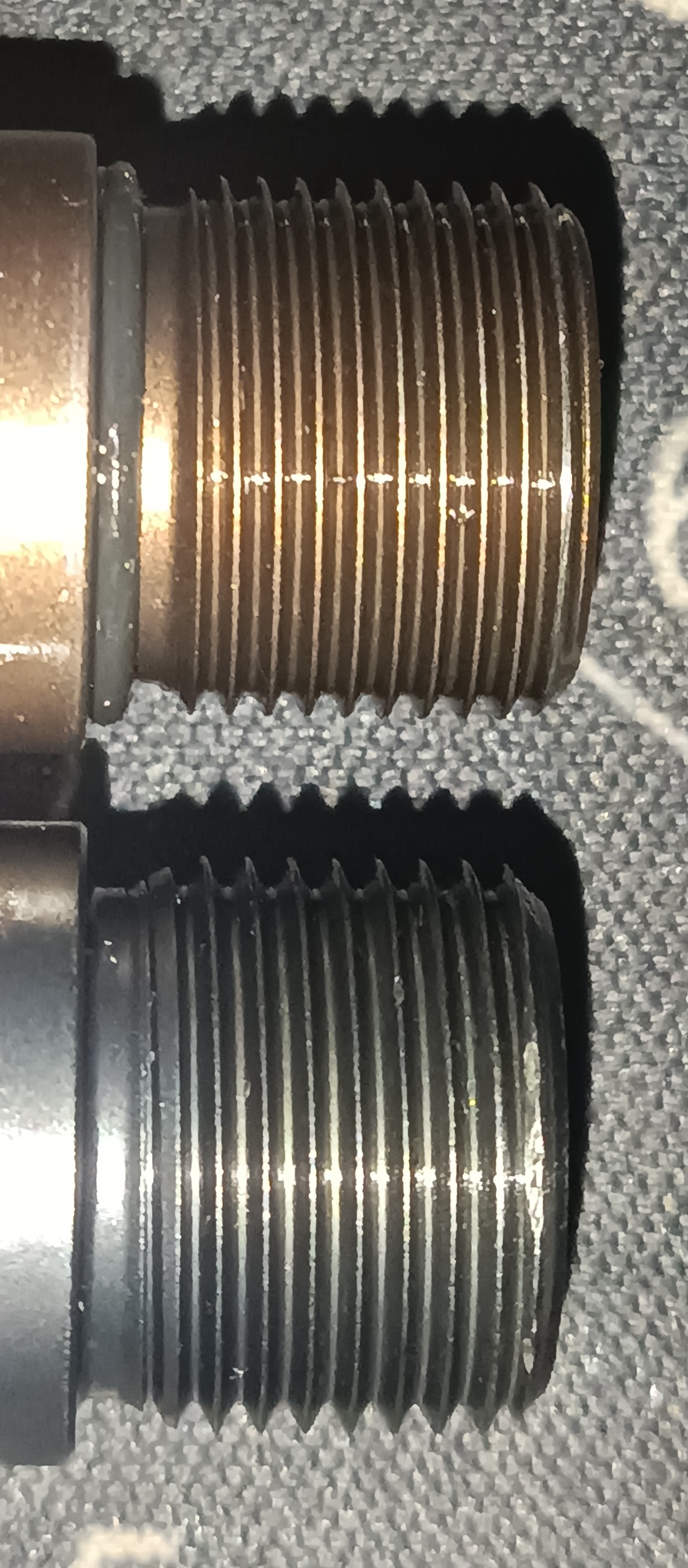 Top is a bronze 1/2x28 G19 barrel from L2D Combat, it works, everything is fine. Bot is a factory barrel that came with a factory used stock G17 gen 4 from Austria, but I can't fit any 13,5x1LH or 1/2x28 thread protector. Thread crown is slightly damaged ; it doesn't seem so bad and you have to illuminate it and zoom a lot so you can notice. What do you think ? I can't really buy another barrel in my country. Many thanks /k/ommando, I'd like to use a can at some point.