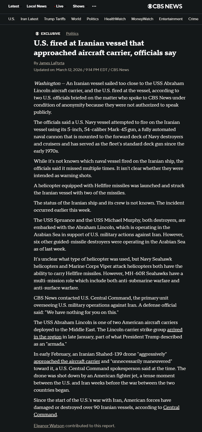 https://www.cbsnews.com/news/us-fired-at-iranian-vessel-that-approached-aircraft-carrier-officials-say/>An Iranian vessel sailed too close to the USS Abraham Lincoln aircraft carrier, and the U.S. fired at the vessel, according to two U.S. officials briefed on the matter who spoke to CBS News under condition of anonymity because they were not authorized to speak publicly.>a U.S. Navy vessel attempted to fire on the Iranian vessel using its 5-inch, 54-caliber Mark-45 gunApparently fucking missed since:>A helicopter equipped with Hellfire missiles was launched and struck the Iranian vessel with two of the missiles.