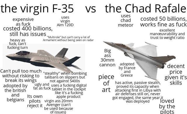 >>64885803No match. F35 is stealth and Rafale has been bettered by gen 4.5 jets.