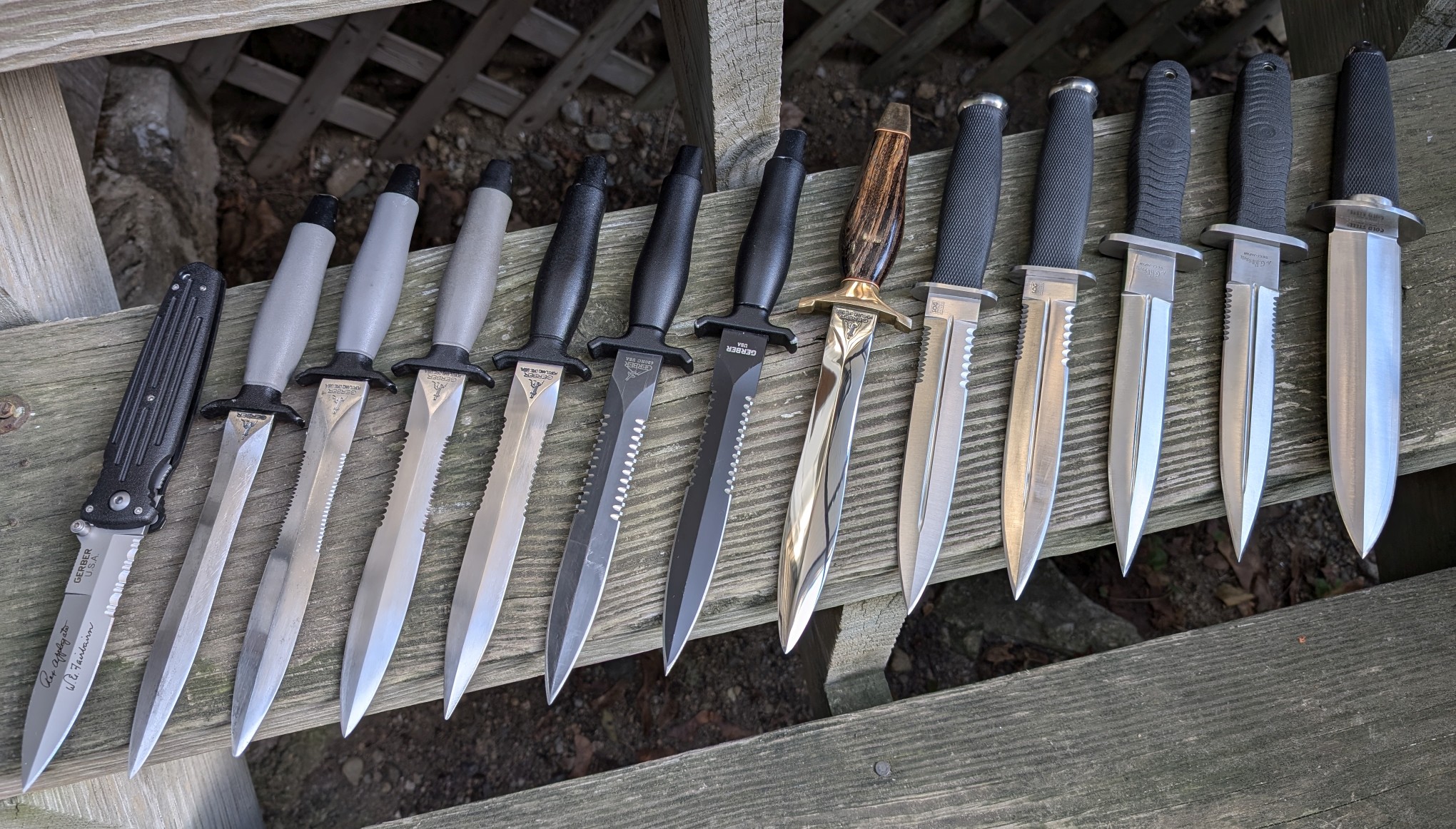 >>64381048>What's the 2nd from left and the 3rd from right? also the one with the fancy wood handle?Gerber Mark II, AG Russel (a version of Seki dagger from the 1990s,) Gerber Mark II presentation.