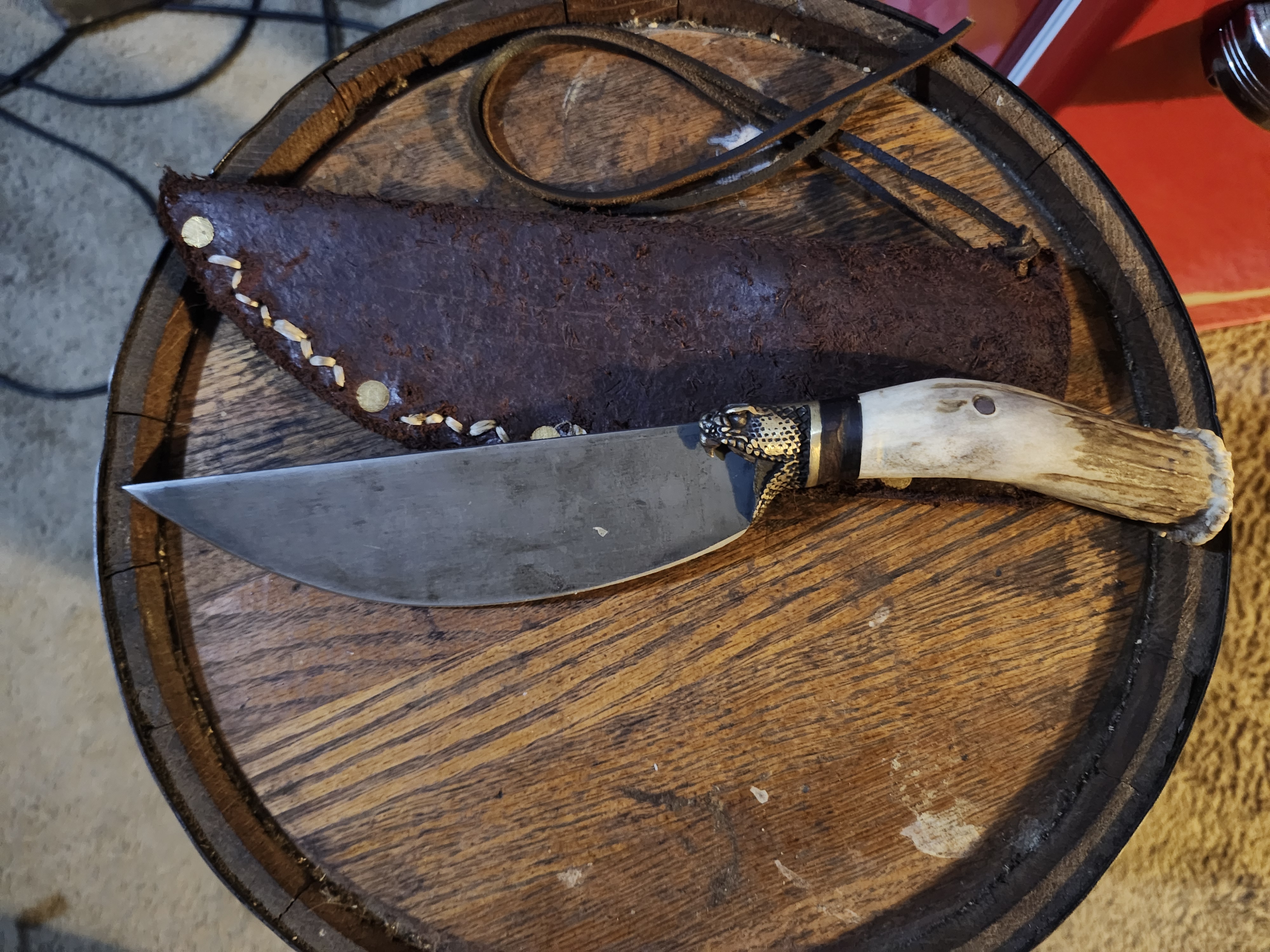 Finished my 18th century style Roach Belly Scalping knife. Used 1095 steel. Just about all of its components came from a flea-market. The brass viper head hand guard came from a walking cane that had a glass marble in its mouth. The leather washers below that came from a steer hide along with the sheath also purchased at said flea-market And the deer antler shed for the handle also came from the flea-market. Ive been cutting it up a piece here and there for handles.Ive got like $20 investment in parts.