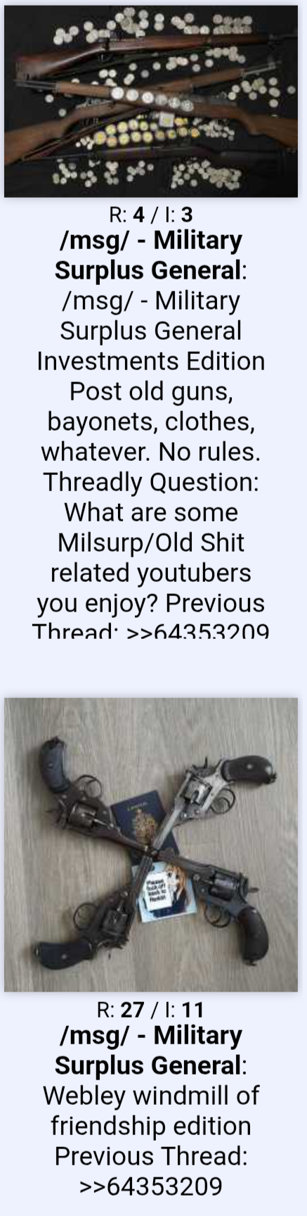 /msg/ - Military Surplus GeneralInvestments EditionPost old guns, bayonets, clothes, whatever. No rules.Threadly Question: What are some Milsurp/Old Shit related youtubers you enjoy?Previous Thread: >>64353209