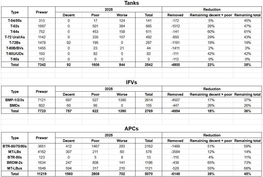 >>64429693>That requires at least 90% of their equipment to ge wiped out.The "worse" category consists of vehicles that are in such bad condition that it can be diagnosed from space. They're unusable, and many of the 'poor' condition tanks will be too since not every problem is visible in commercially-available satellite imagery. That means in the last 3.5 years the Russians' reserve stockpiles of tanks and IFVs have shrunk by 77% and 82% respectively. And again, the remainder aren't all usable. The Russians absolutely do not have another 3 years of war left in them. They'd even be out of donkeys long before then.