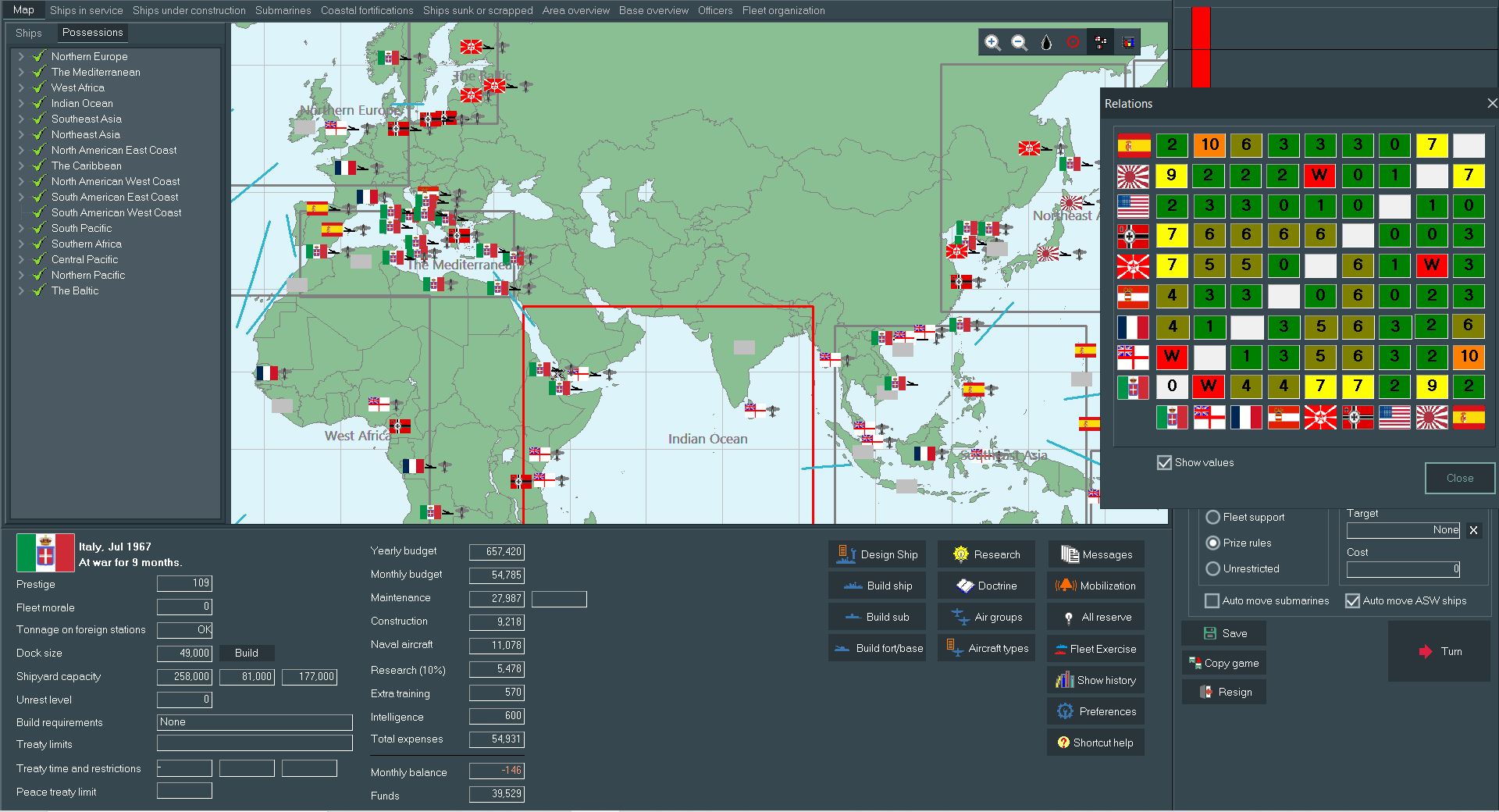 A quick recap of our current situation. Having established a domination of the Mediterranean, the Italian empire stretches from Iceland to Sakhalin. Of course peace is no good for the makers of shells, so war with the British has broken out once again. We'll examine the strategic situation and fleet in the next couple posts.