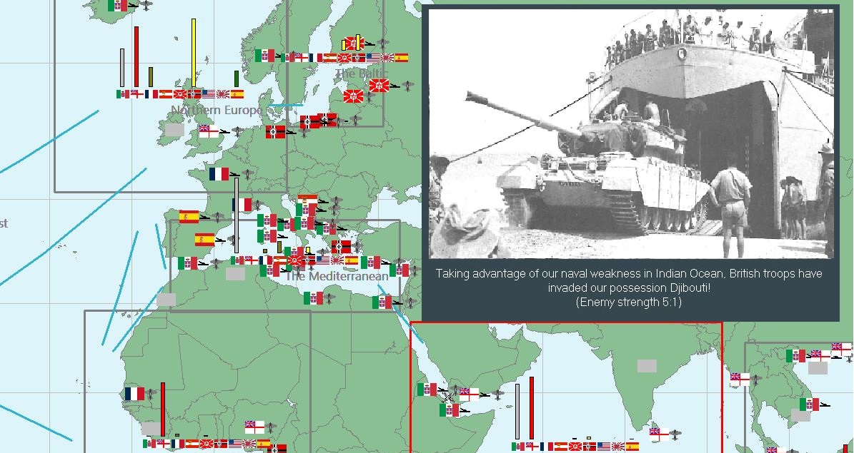 The current main front is in the Indian Ocean, which until recently has been lightly patrolled by our fleet. Taking advantage of this, British troops landed at Djibouti before our ships arrived to contest the sea. Despite this, the Brits still hold a slight advantage in local forces.