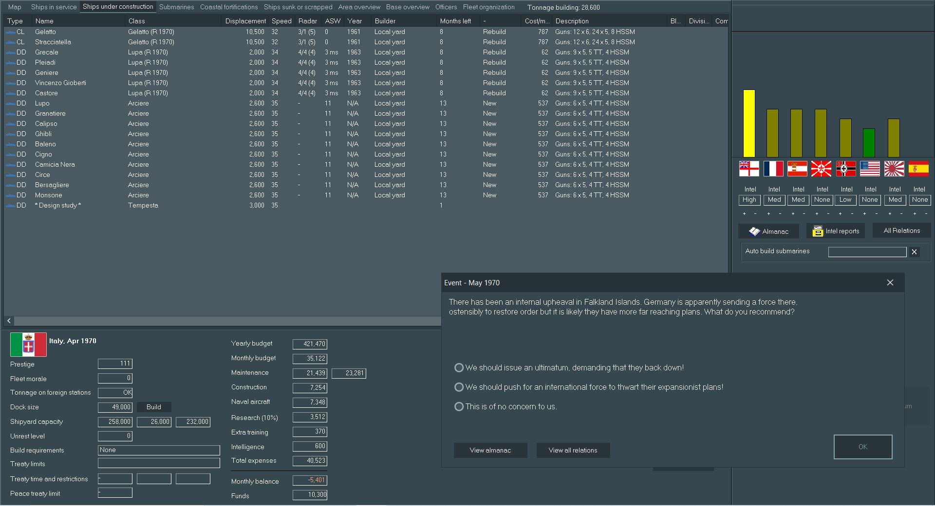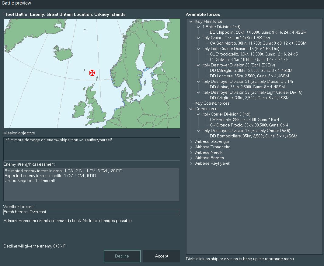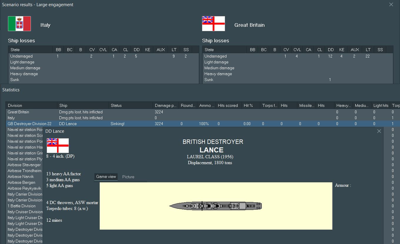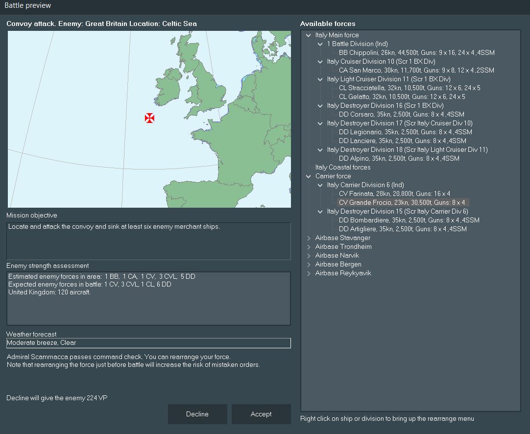 An astute viewer may note a large Italian presence in the Mediterranean with no contesting British forces and wonder why those forces have not been deployed. On one hand, the pair of Calligula-class heavy cruisers and a good deal of modern destroyers would be well-suited to repositioning. However, much of the rest of the ships in home waters are outdated. Three flight decks (one fleet/two light) patrol the Med, but could move to the Indian Ocean to serve as somewhat outdated but still viable units.
