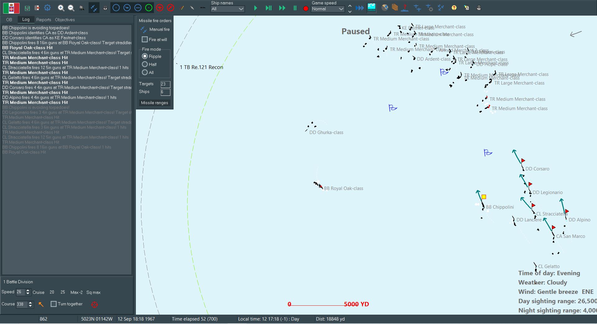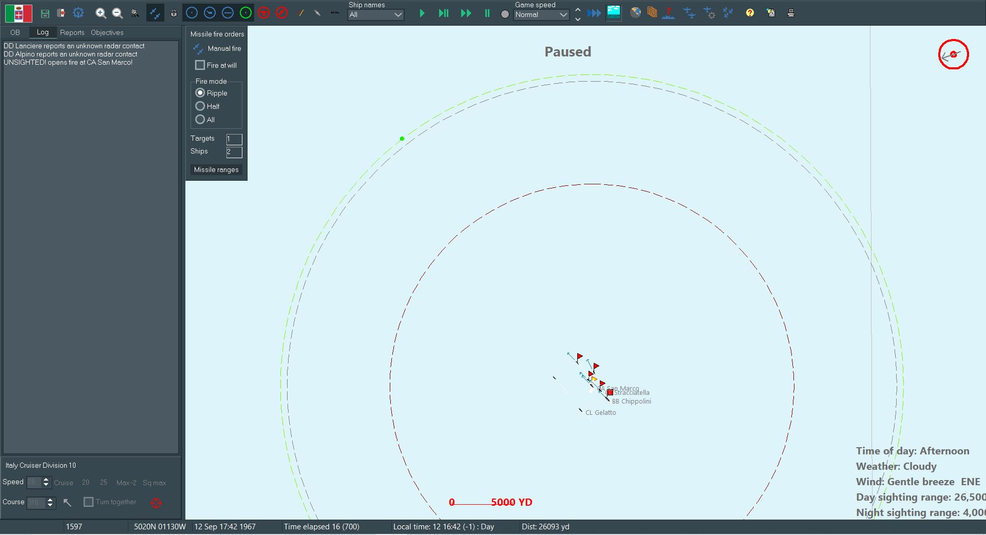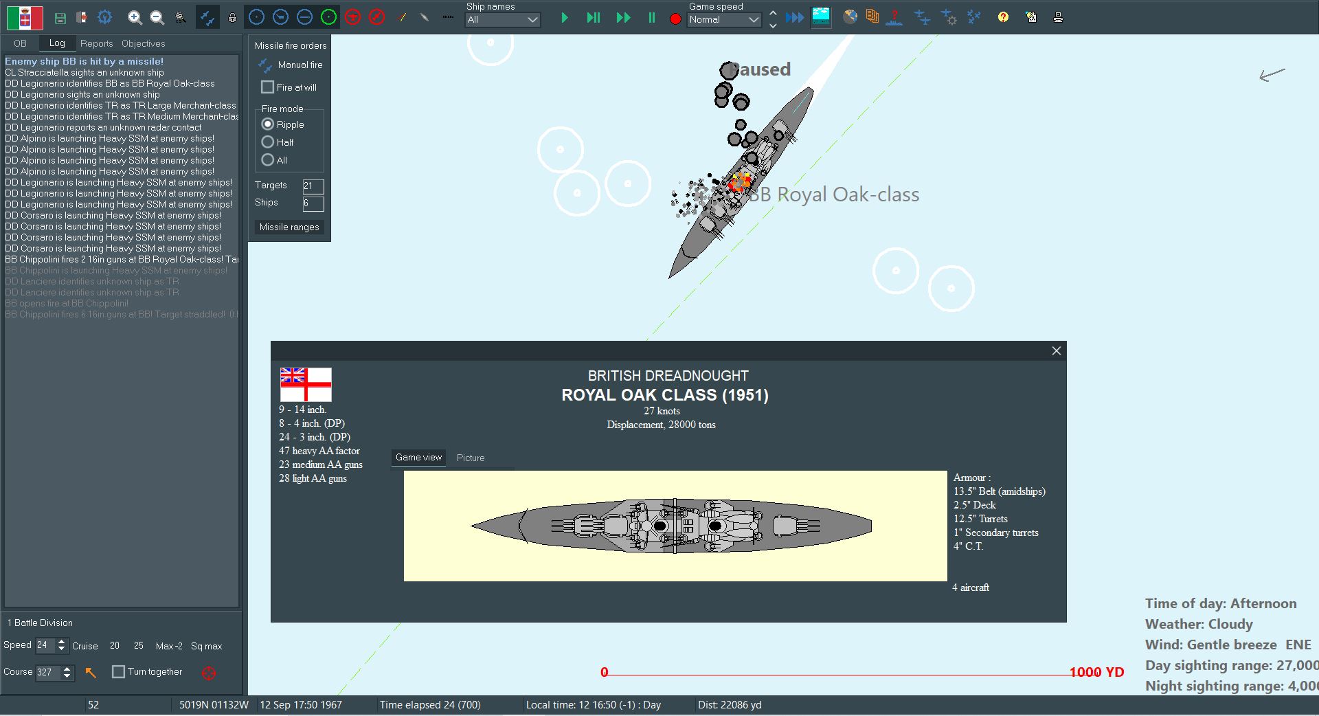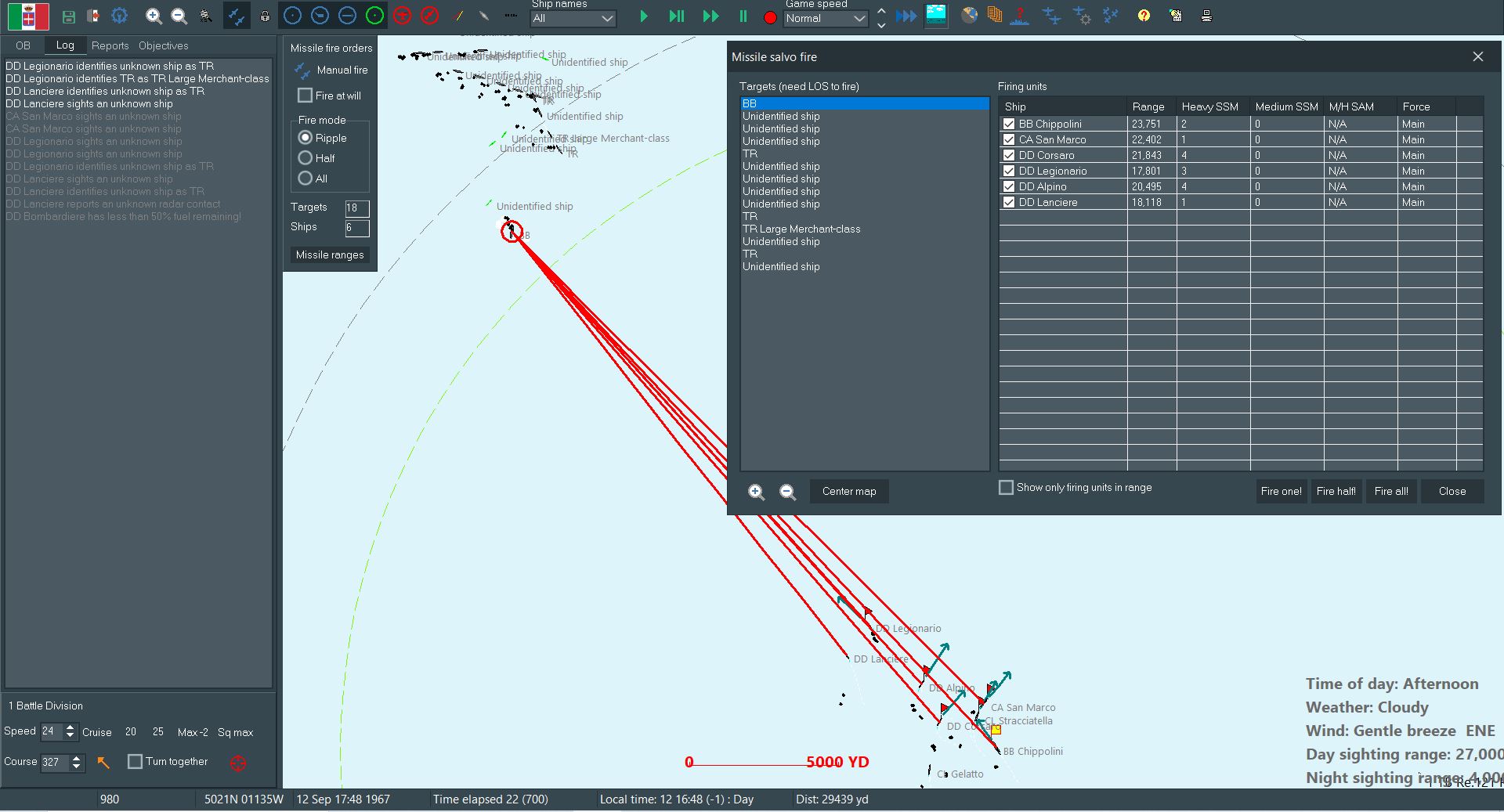 However, Italy does hold a key advantage: we have invested considerably more into missile outfitting. Most of our ships carry a pair or quartet of heavy anti-ship missiles, some of them even have a reload available. With any luck those missiles will make up for the difference in the fleets.