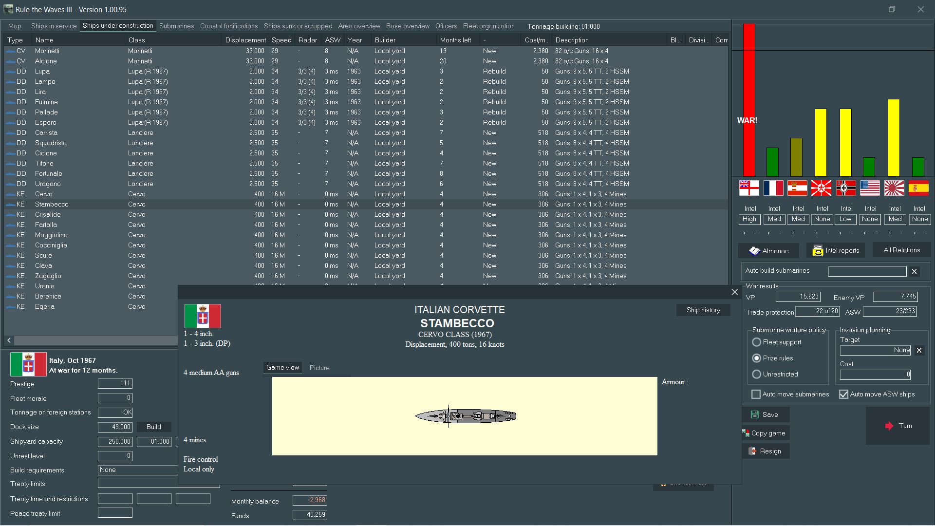 Light forces is a bit of a wash, with comparative numbers of destroyers for each side. Italy holds an advantage in the submarine game, while the Brits have made up a numerical advantage in corvettes by pressing many civilian vessels into service.