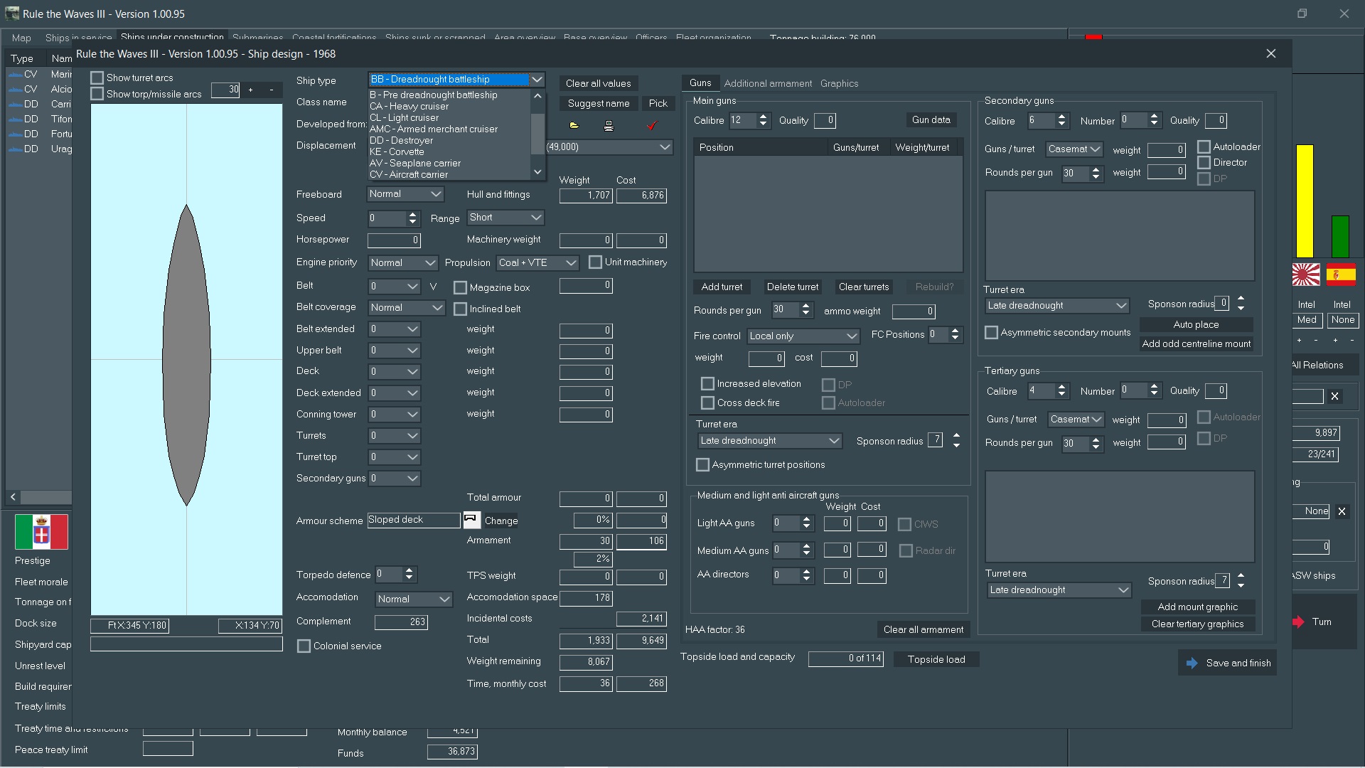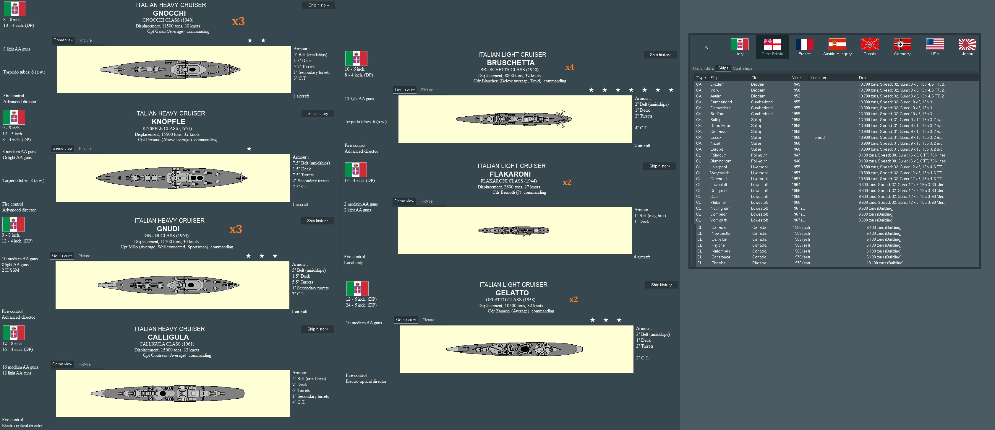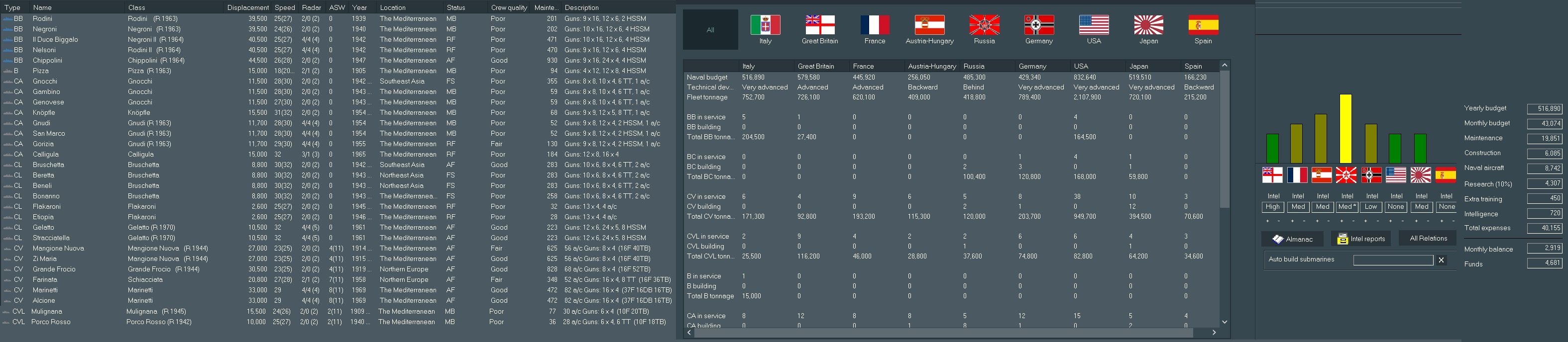 So far, /k/ has been guiding the progress of the Italian Navy through the late 1800s and into the 1960's, leading us forward on a quest that hopefully ends in Total [Non-Italian] Death, Italian supremacy in the Med and eternal glory for the restoration of Rome. I'll be presenting you with designs made to your specifications, choices the game throws at us regarding politics and commentary of battles. A list of suggested names for ships and aircraft is being built, so feel free to throw out your requests as well. Finally, keep those (You)s flowing in to keep my dopamine levels high.