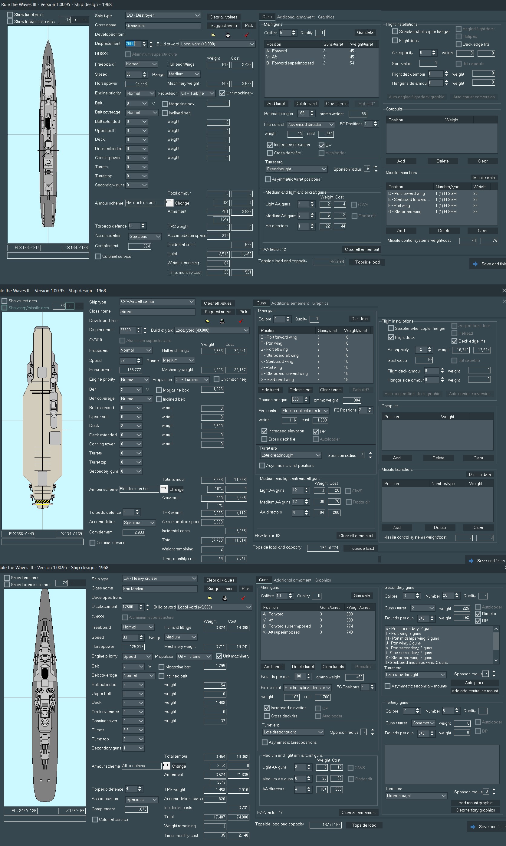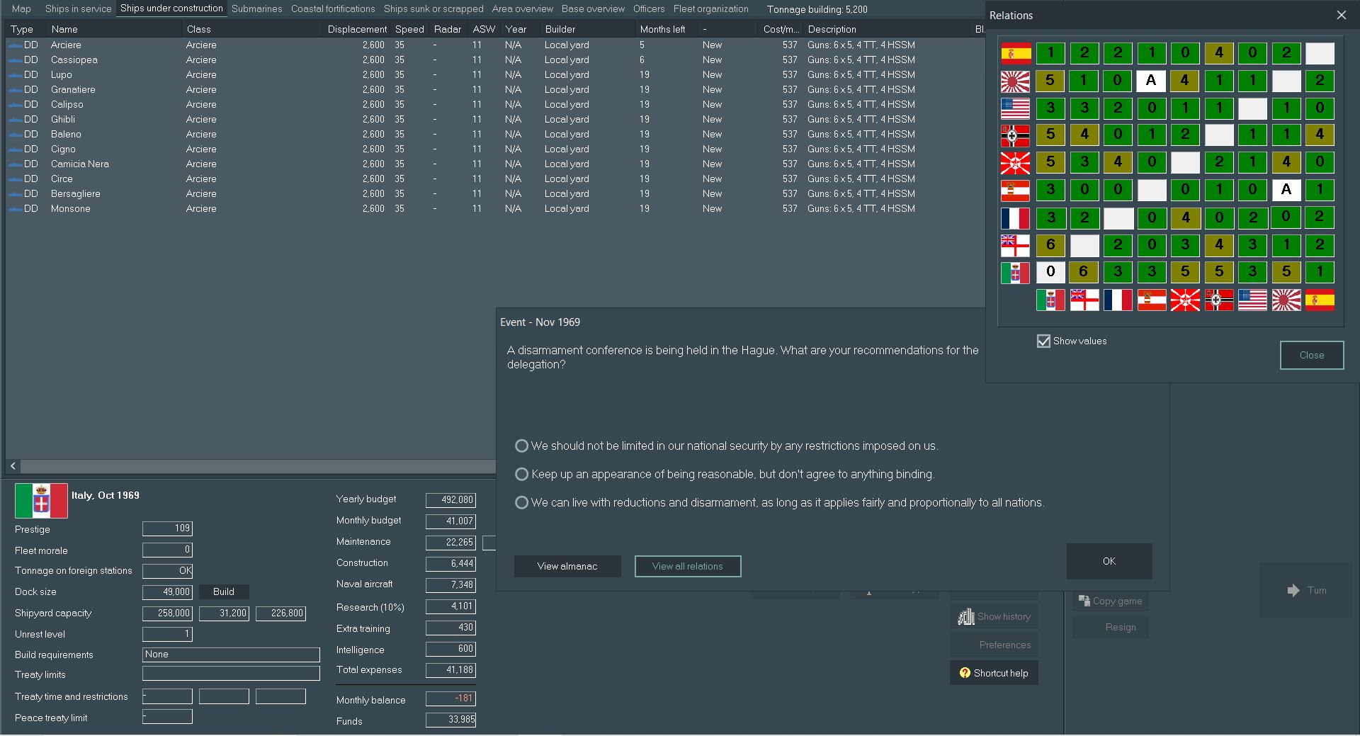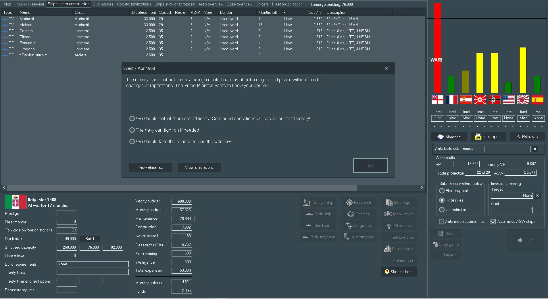 So far, /k/ has been guiding the progress of the Italian Navy through the late 1800s and into the 1960's, leading us forward on a quest that hopefully ends in Total [Non-Italian] Death, Italian supremacy in the Med and eternal glory for the restoration of Rome. I'll be presenting you with designs made to your specifications, choices the game throws at us regarding politics and commentary of battles. A list of suggested names for ships and aircraft is being built, so feel free to throw out your requests as well. Finally, keep those (You)s flowing in to keep my dopamine levels high.