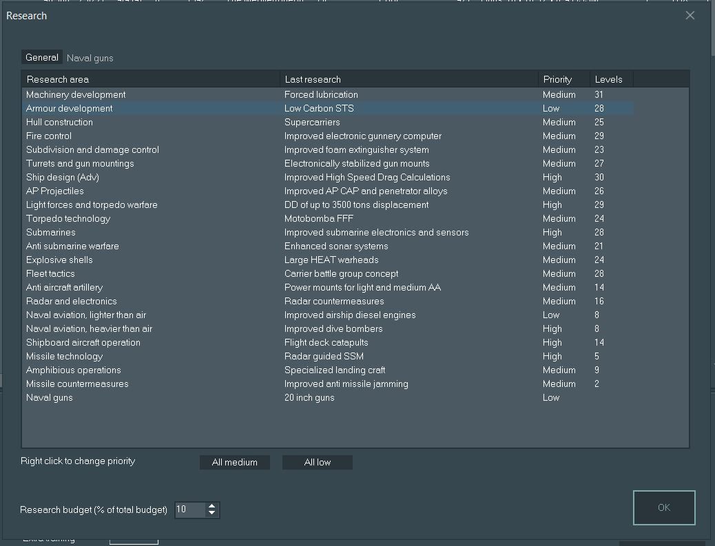 If that wasn't alarming enough, there's a quirk to how RtW handles research is that every tech has a chance of being skipped in a given cycle of research. As an example, in the year 1923 there are techs such as "Integral armor" and "Enhanced explosive filler", both of which have a chance of being researched of 90. Makes sense, everyone wants more efficient armor and more boom is good for shells. But in that same year "All forward main armament" has a chance of only 60. These techs aren't locked off forever, each new cycle your scientists have a chance to 'go back' and figure out what was missed, but it can still lead to significant delays. With that being said, we've missed a very painful tech