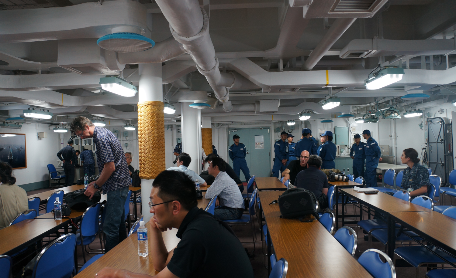 Also if you liked those duty uniforms, there are some more wearing them in this pic. This is a boring pic but that's what it's like covering military exercises. A lot of waiting around. You land on the ship and they take you into a conference room, serve water, take you to the bathroom, etc. and hand out literature about their ship and a gift postcard. Then you go up onto the deck to take pics of flight ops and try to get a good pic. Most of the reporters are Japanese but the bald white guy with the big camera and olive green surplus bag was Stars & Stripes. I followed those dudes out through the door down the hallway to the left into some mechanical room for a smoke break and told them they kept a very clean ship, which is true. They were very polite and came across as highly disciplined.