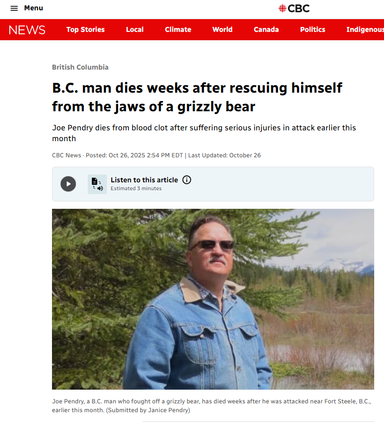 https://www.cbc.ca/news/canada/british-columbia/joe-pendry-grizzly-bear-attack-east-kootenays-9.6954326>go hunting, loaded for elk>get attacked by a grizzly>shoot it in the leg (it later dies of sepsis)>fight it off>die weeks later of a blood clot due to injuries sustainedI wonder what he was doing to only get one non-immediately-fatal shot off.