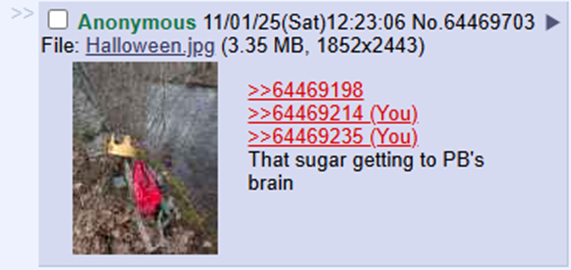 >>64469198>>64469214>>64469235That sugar getting to PB's brain