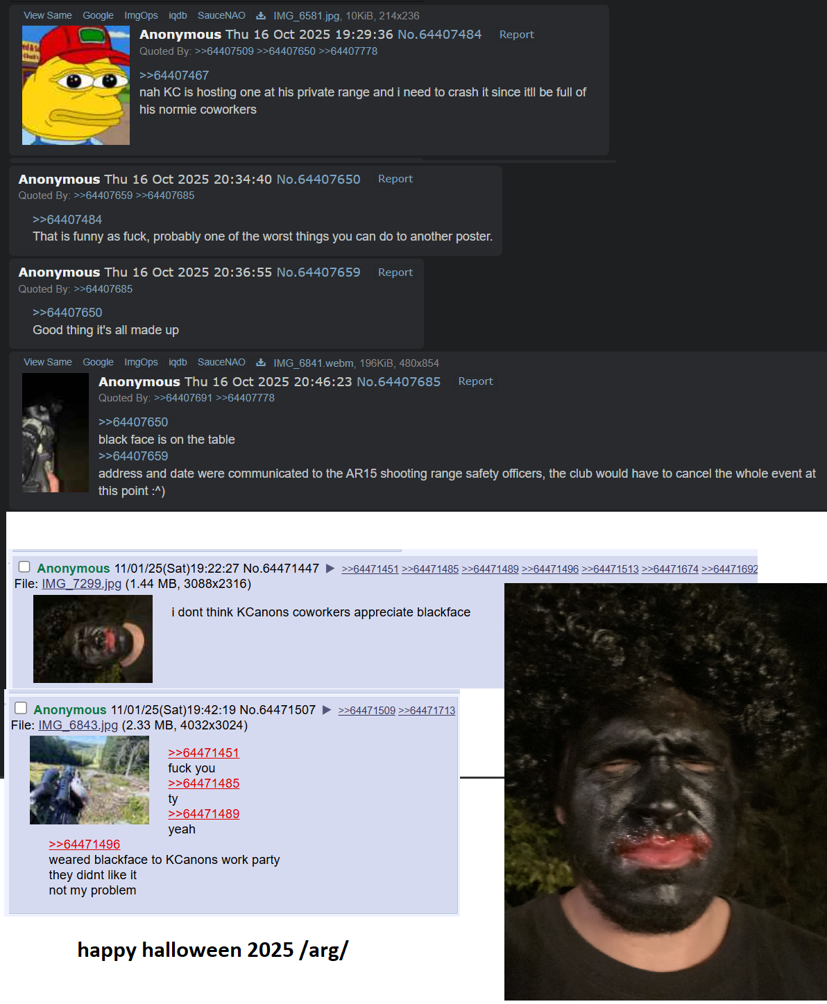 >>64471496Someone thinks black face is funny and its not. I hope they know that you can easily find who someone is by their face. I hope whoever it is doesnt have a job because they will lose it soon.