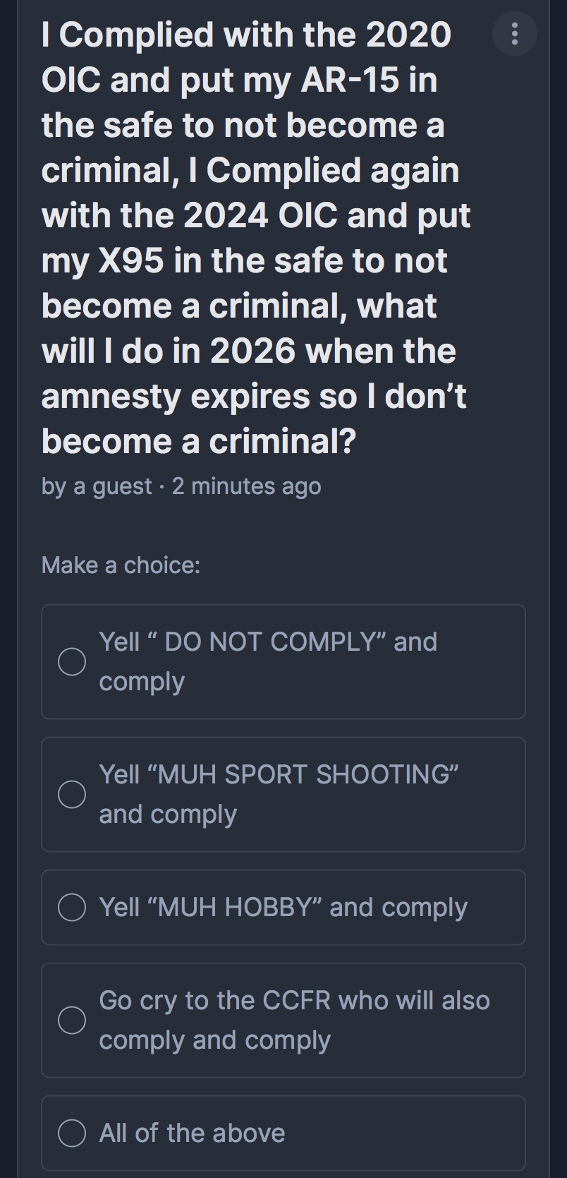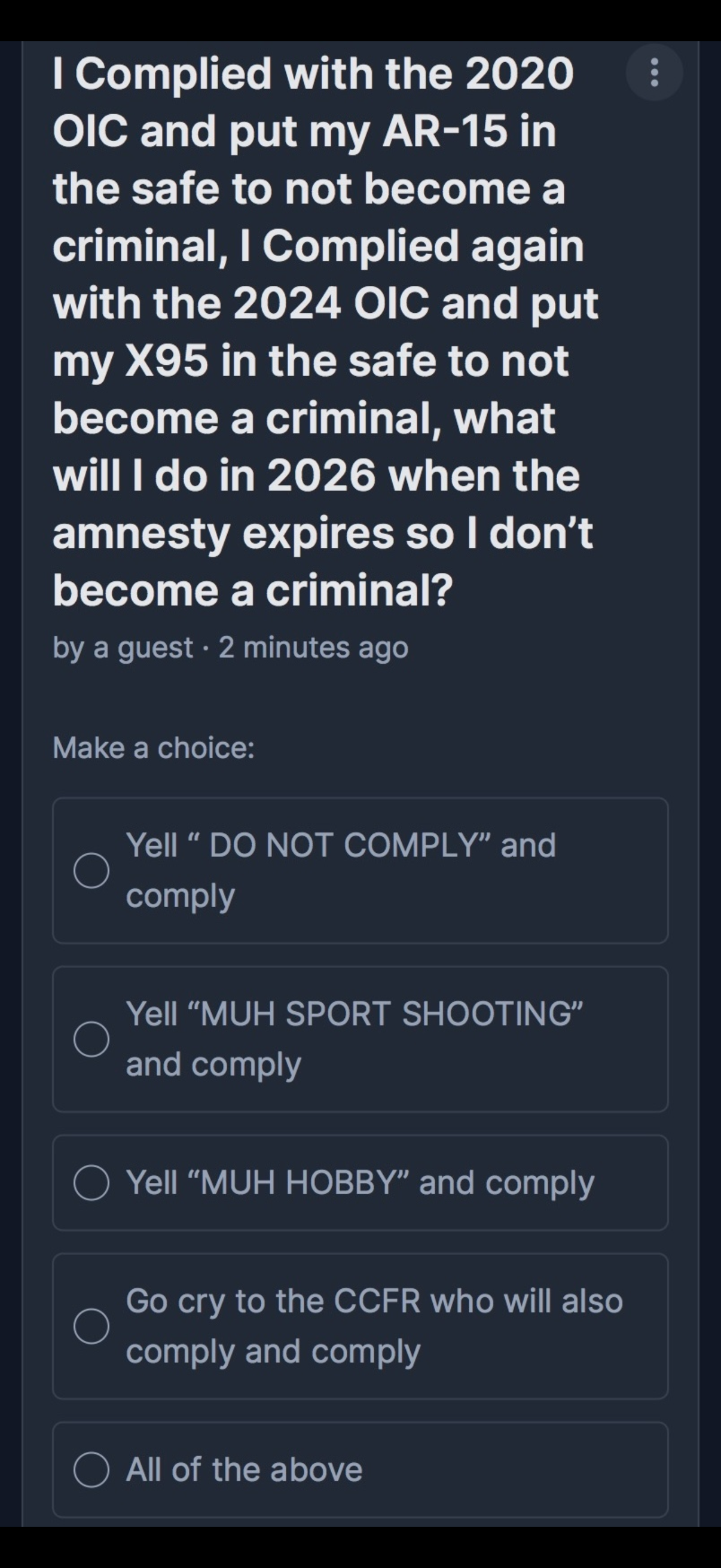 Canadian Firearms GeneralTHE RESURRECTION SHALL CONTINUE, UNTIL MORALE IMPROVES, EDITION.>New here? Read this:https://pastebin.com/Ndb2jSAuhttps://howtogetagun.ca/>Want to hunt? CFG Hunting license info:https://pastebin.com/nC8RpYb3>Want to buy something? Recommended /cangen/ vendors list (patched 04.25.2024):https://pastebin.com/4pshBiBt>Want to help firearm rights?https://firearmrights.cahttps://nfa.cahttps://cssa-cila.orgPrevious >>64554807