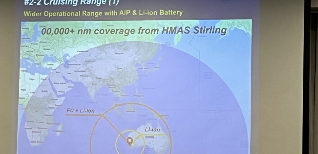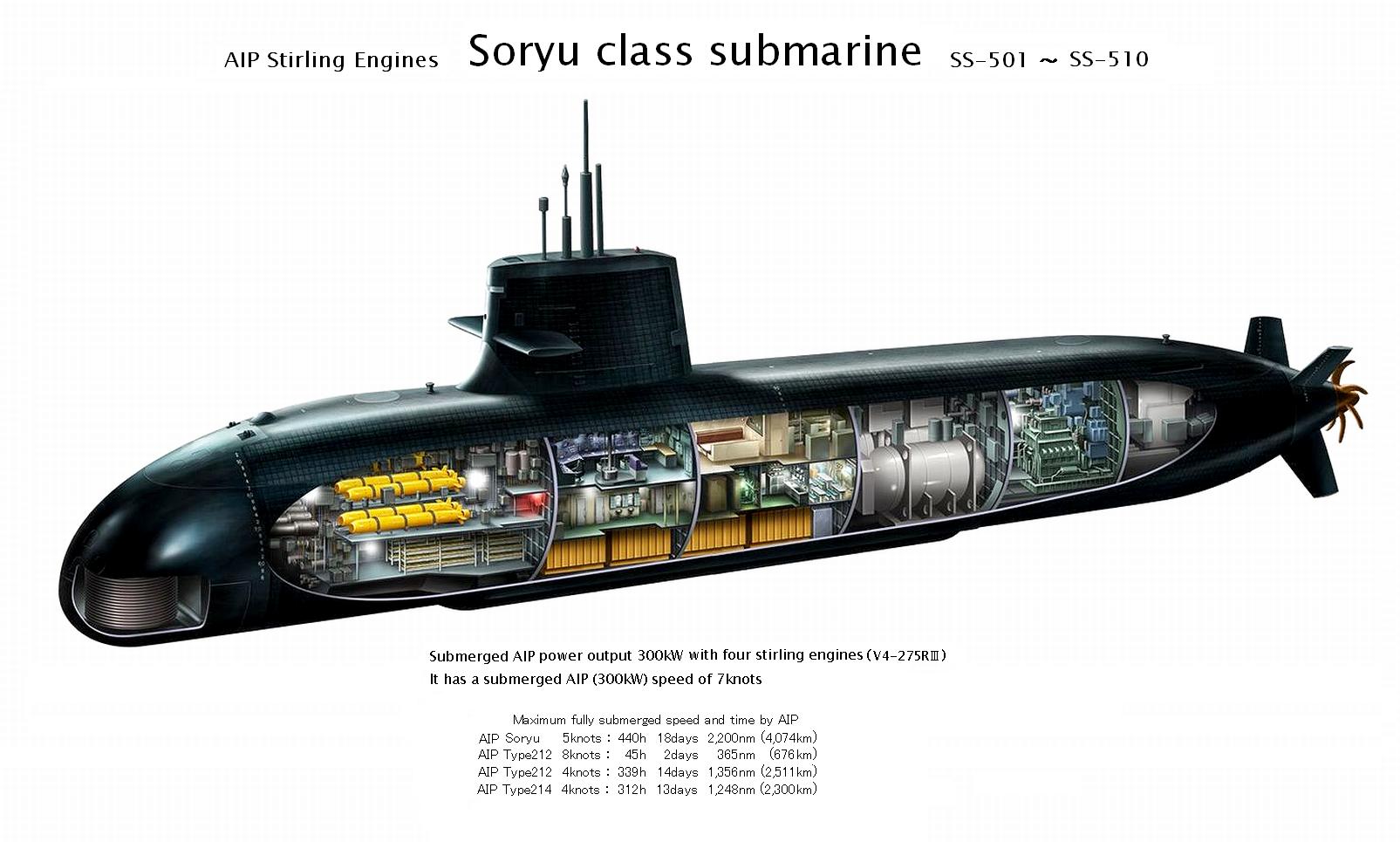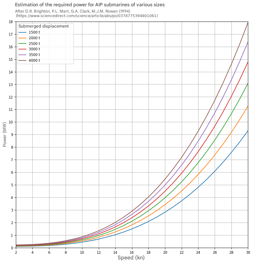 >The much bigger Soryu at 4000t has 4x75kW stirling for a total 300kW output, that's not even enough for 5 knots transiting.