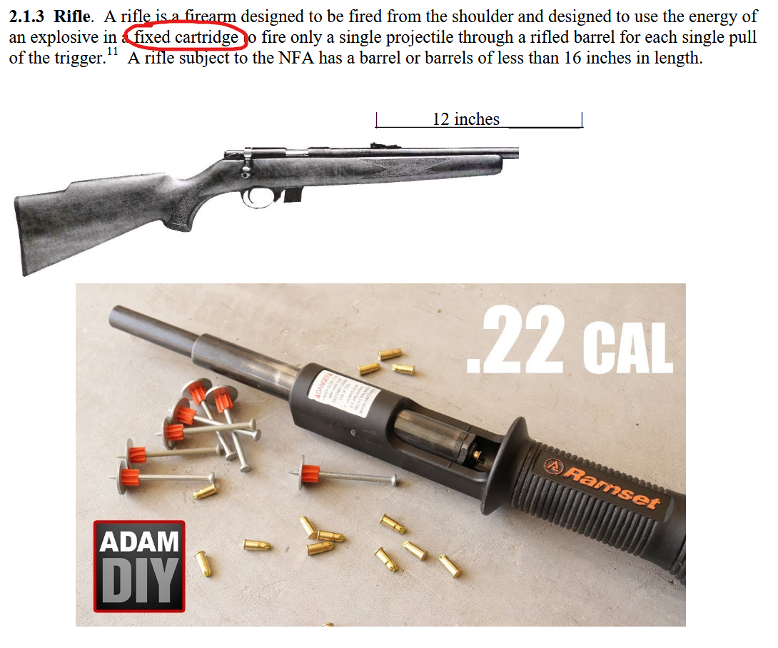 we could skirt the NFA entirely if we just didn't put bullets in cases.think about it: ramsets are not considered firearms, and they shoot nails with blanks.a gun that uses a blank case full of powder shooting a separate bullet would not meet the definition of any sort of firearm according to the NFA.i cracked the code, you're welcome.