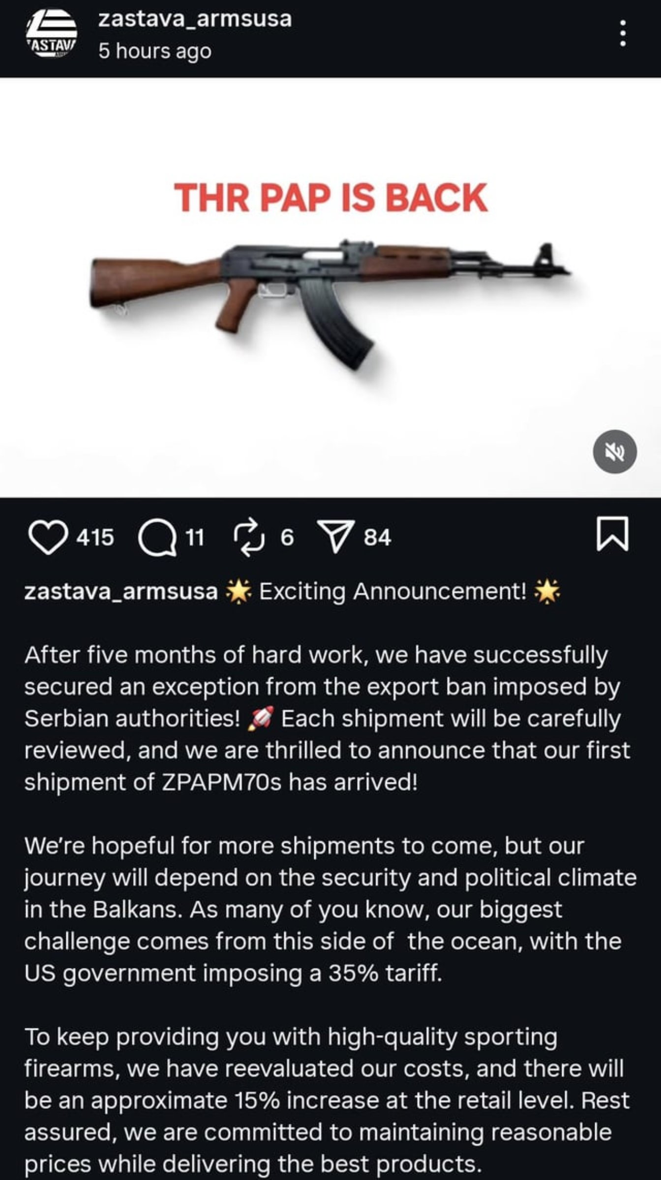 Zastava has secured an exemption on their end to export civilian guns. Prices set to rise still because of state side shenanigans. But at least they're coming back in again.