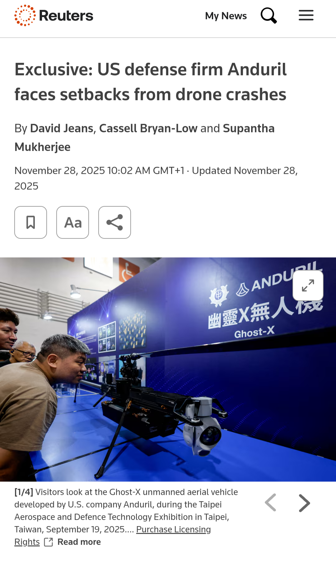 >NEW YORK, Nov 27 (Reuters) - A U.S. military plane soared over Florida's Eglin Air Force Base earlier this month and released a drone made by the defense tech giant Anduril Industries to test whether it could take flight and conduct surveillance.>The drone – a winged model known as Altius – nosedived 8,000 feet into the ground, according to an Air Force test summary, reported here for the first time. Shortly afterwards, a second Altius drone spiraled to earth during a separate test, the summary said.>The company has ridden a surge of investment into military tech that has helped its valuation more than triple since late 2022 to $30.5 billion.>Anduril's 33-year-old founder Palmer Luckey said in March, opens new tab that Altius drones have "taken out hundreds of millions of dollars worth of Russian targets." In August, he traveled to Taiwan to deliver the company's first batch of the drones there. Taiwan's army told Reuters it had received 131 Anduril drones this year and declined to comment on the performance of the equipment.>But the previously undisclosed failure of the two Altius drones during the Air Force tests this month, as well as setbacks for Anduril's Ghost drone program - including in Ukraine - highlight a gap between the U.S. company's claims of battlefield readiness and the performance of some of its drones in testing and combat, according to interviews with more than a dozen people, including former Anduril staff, military officials, and people working with drones on the Ukrainian battlefield.>Western drone makers, including Anduril, have had limited impact so far on the battlefield in Ukraine. Mykhailo Fedorov, a deputy prime minister of Ukraine, said on Telegram in November 2024 that of one million drones deployed to the front lines that year, 96% were Ukrainian-made.Grifters have been finally exposed:https://www.reuters.com/business/aerospace-defense/us-defense-firm-anduril-faces-setbacks-drone-crashes-2025-11-27/