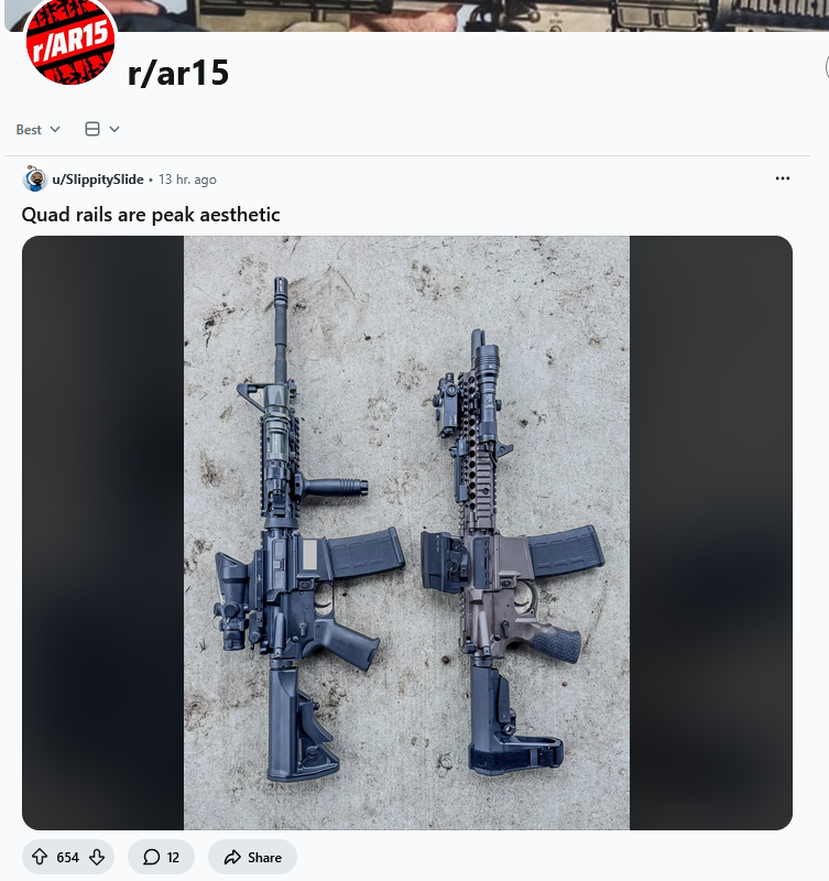 >>64602083My cope is that a rifle being posted on Reddit doesn’t make it inherently Reddit.There is of course some degree of universality with regard to AR15s and aesthetics. A rifle that is distinctly Reddit however is going to be one you’d find most often on Reddit and very infrequently elsewhere save for cross-posting across forums.One example would be >Complete Radian or KAC upper Radian lower >Modlite >PlxC 1-8 >Civilian class Raid Xe or MAWL>Scalarworks variety of mounts Reddit seems to be downstream of whatever YouTube is collectively shilling.Block 1 & 2 builds get love, mostly for nostalgia and aesthetics and it stops there favoring modern offerings for practical use whereas 4chan generally sees Block 1 & 2 era builds as peak performance with some caveats.