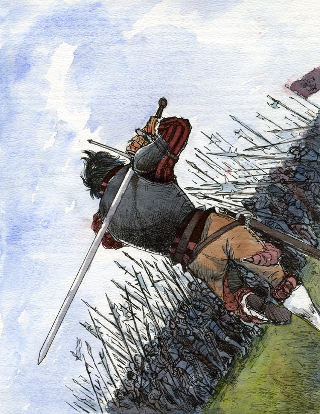 Halberd but will do fine with wooden poles/spears all that matters is extreme formation discipline.