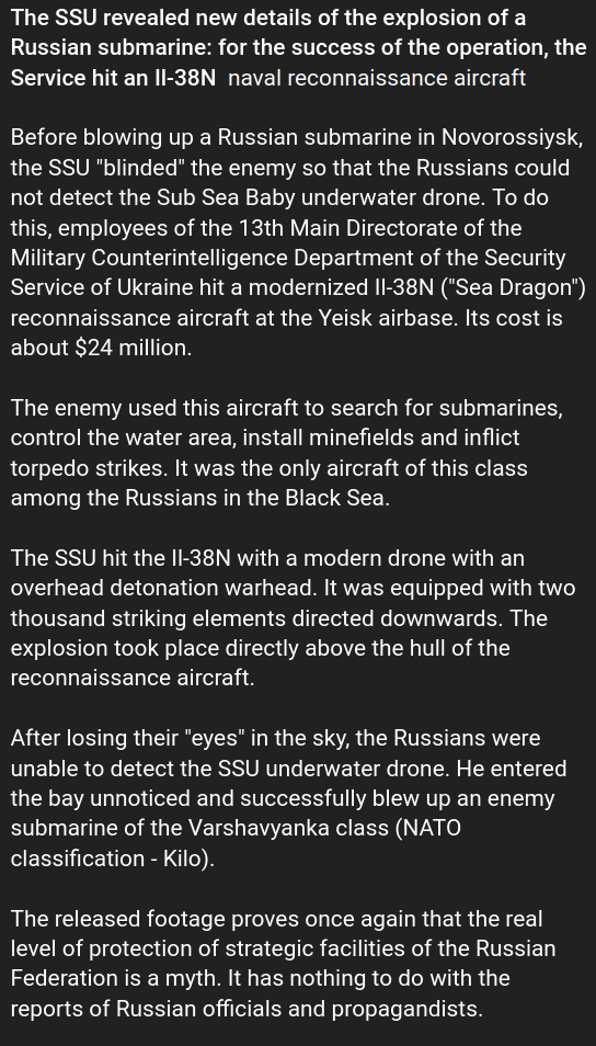 >>64662724>Our favourite arms procurement spreadsheet enjoyer just came out with a new video about the recent use of UUV's;Does it mention the Il-38N?Because that was an unknown part of this op until SBU just made their post today.This is a big deal because there were only eight of these made and only one assigned to the Black Sea.There are seven remaining in service and Russia needs them in three other places.