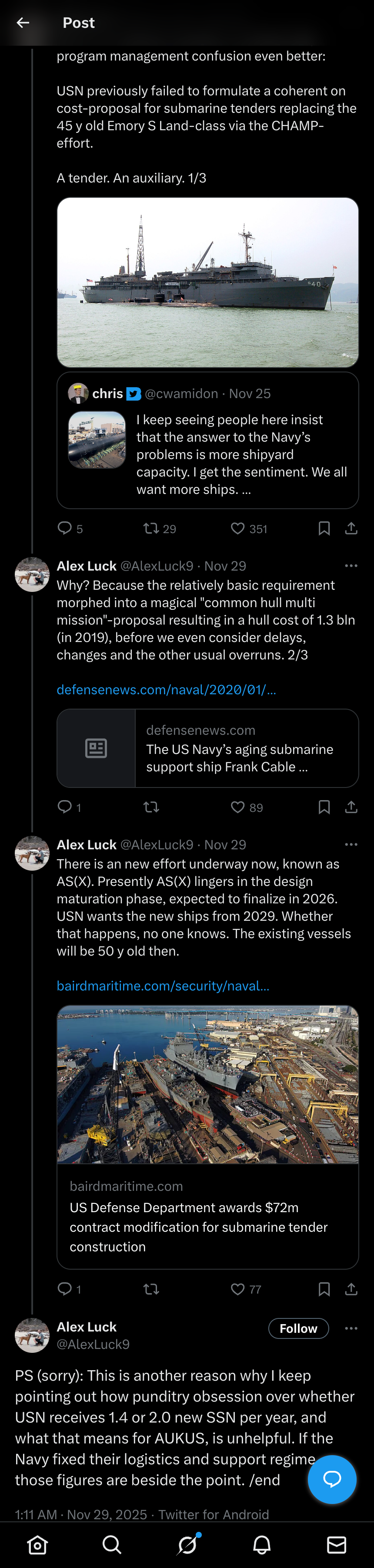 >>646865671) Reactor up-front costs are really high. USN PWRs aren't built to civilian standards; they're designed to not melt down or suffer a steam explosion in the event that a torpedo or missile takes off the bow and inflicts massive shock to the whole ship. The idea is that the only way to breach a reactor is to set off a warhead practically inside the engineering compartment. That's expensive.2) Going along with that, reactors require more highly-trained operators than a civilian plant of similar size, because they have to be able to keep the reactor running even if the ship got hit, and SCRAM the reactor if it happens to take critical damage itself. Threads on nuc school are legendary on /k/. The dropout and suicide rates are absurd. That sharply limits the number of nuclear engineers that can be trained each year, and subs and CVNs are pretty much taking everyone who makes it through.3) Reactors are very nice to have, but not a strict necessity for anything other than large, long-ranged subs (AIP is great, but not if you have to operate thousands of miles away from port for weeks/months). They are very, *very* nice to have for carriers, and doubly so for supercarriers. For anything else, the benefits are smaller and therefore have to be weighed against the costs (see above).Usually only lighter items (people, mail, small spare parts, etc.) are flown in. The big stuff--especially fuel, which CVs still need for jets--can only efficiently be delivered by at-sea replenishment from another ship.