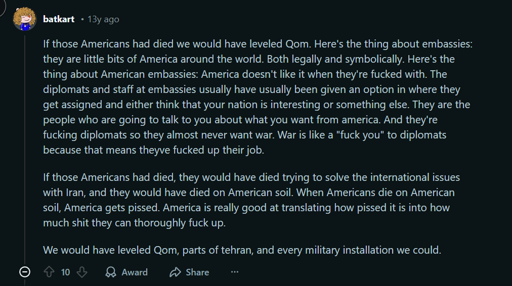 >>64705409Is this about the Iran Embassy Crisis?>IranThose motherfuckers have pulled so much shit regarding basic international decorum I'm surprised they even get any sort of embassy or even recognized by any other nation.