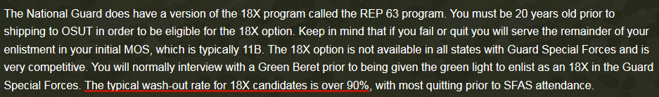 >>64726795I'm ignorant, but I though the 18x and option 40 gave you a path where there were a few failure points where you could wash out before selection whereas buds was open to anyone, even people from other branches. My only primary source is a guy I went to HS with who enlisted in '03, had his first deployment before he could exercise his ranger option, then went GB, and from there was obviously recruited to something else.