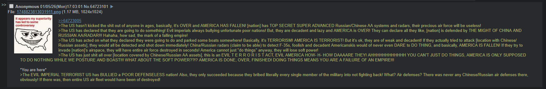 >>64716499>watch russian AA fail for 4 years>watch russian AA fail in venezuelareally makes you think huh