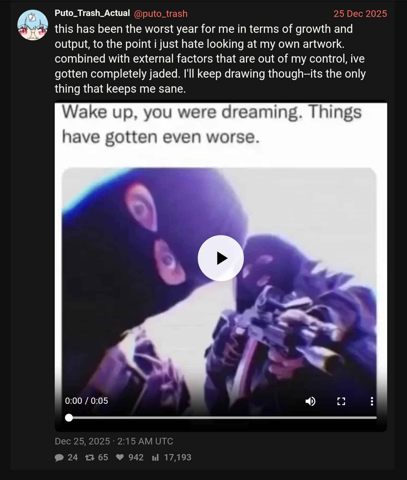 >>64730669Started light doomposting around krimas. Hes a good artist, I hope he understands that social media numbers are not indicators of the skill at his level. He doesnt post flavor of the month normie slop so of course hes gonna stay a little niched, but a close audience can be just as helpful and loving as having a million drones follow you.