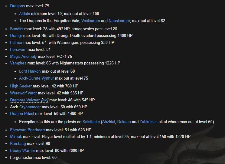 >>64741302>No level capThe enemies in Skirim did have a level cap. Once you reach level 80-100 they stop getting stronger, after that their most powerful variant will just spawn more often. (picrel)>areas are level scaled depending on what level you had when you enter themIf you completely clear a place full of enemies, when they respawn their levels will be updated in both games.>and general sponginess of enemies like you mention.This is because in FO4 the enemies health pool had no level cap while in Skyrim they did.