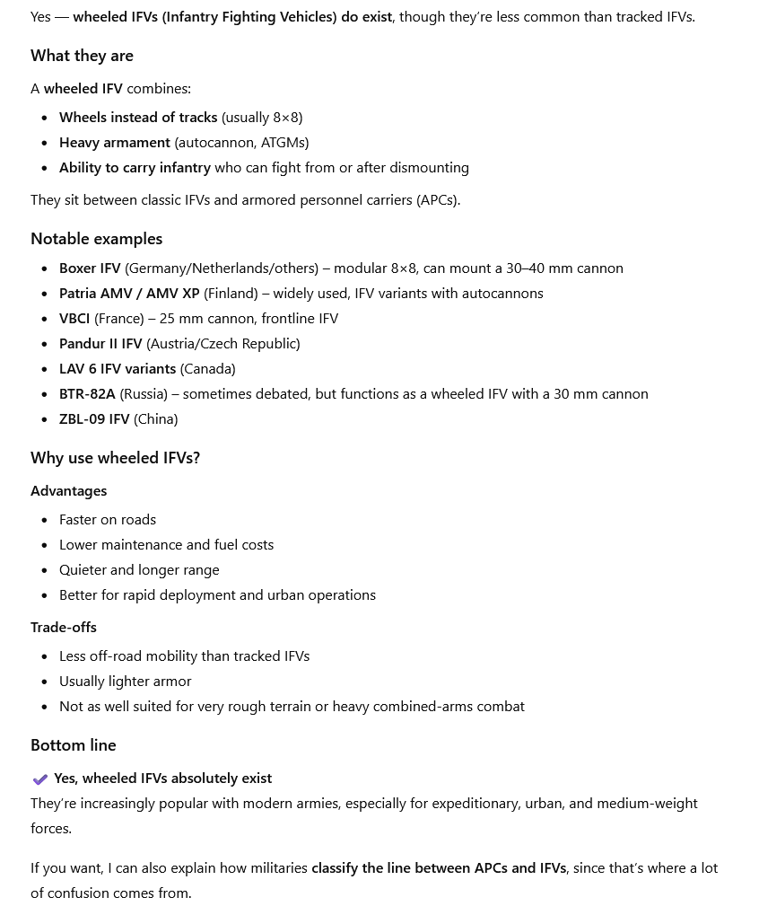 >>64741555>Wheeled IFVsYou can use a AFV in the IFV role, but that doesn't make it a real IFV.