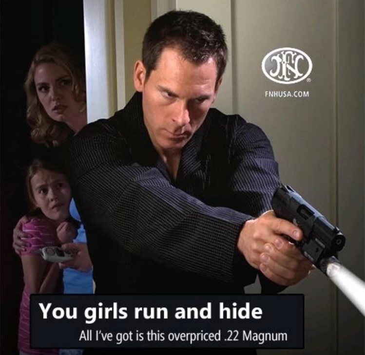 >Own a 5.7 hangun>Someone with a 9mm calls my 5.7 a glorified 22 magnum, and tells me it's useless>Own 9mm handgun>Someone with a 45 ACP calls my 9mm a glorified .22 lr>Own a 45 ACP handgun>Someone with a 10mm says my 45 is a glorified 9mm>Own a 10mm handgun >Someone with a 357 magnum says my 10mm is a glorified 357 sig>Own a 357 magnum >Someone with a 44. Magnum says my 357 magnum is a glorified 10mm>Own a 44 magnum>Someone with a 9mm says it's too impractical and heavyWhy are gun fags like this?I hate to sound like a Fudd, but outside of specific incidents 22 lr will kill most people, because shot placement matters more than caliber 80% of the time