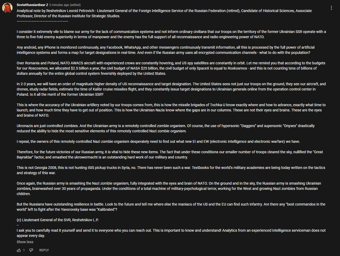 >>64746307>Isn't this the "eyebrows are raised" guy? God damn, even he's totally disillusioned by the war.That's our old friend Vladimir Solovyov, who is a top notch propagandist. Russians suck at everything exept propaganda and it tricks many westerners like it did to you just now.Solovyov's show is to be a mixed panel show that ostensibly airs many criticisms of the system and the war, but not really. It's all orchestrated by the regime to give the illusion of choice and to herd people towards pro-war positions. They'll criticize the war for being prosecuted wrong: therefore the war effort should be doubled.He'll have some raving ultra-nationalist who wants to genocide the Ukrainians. Therefore, the government's position seems much more moderate in comparison and reasonable. Even if it sounds like a critique logically follow it through and it's always a pro-government position. It's all orchestrated and all a dance.