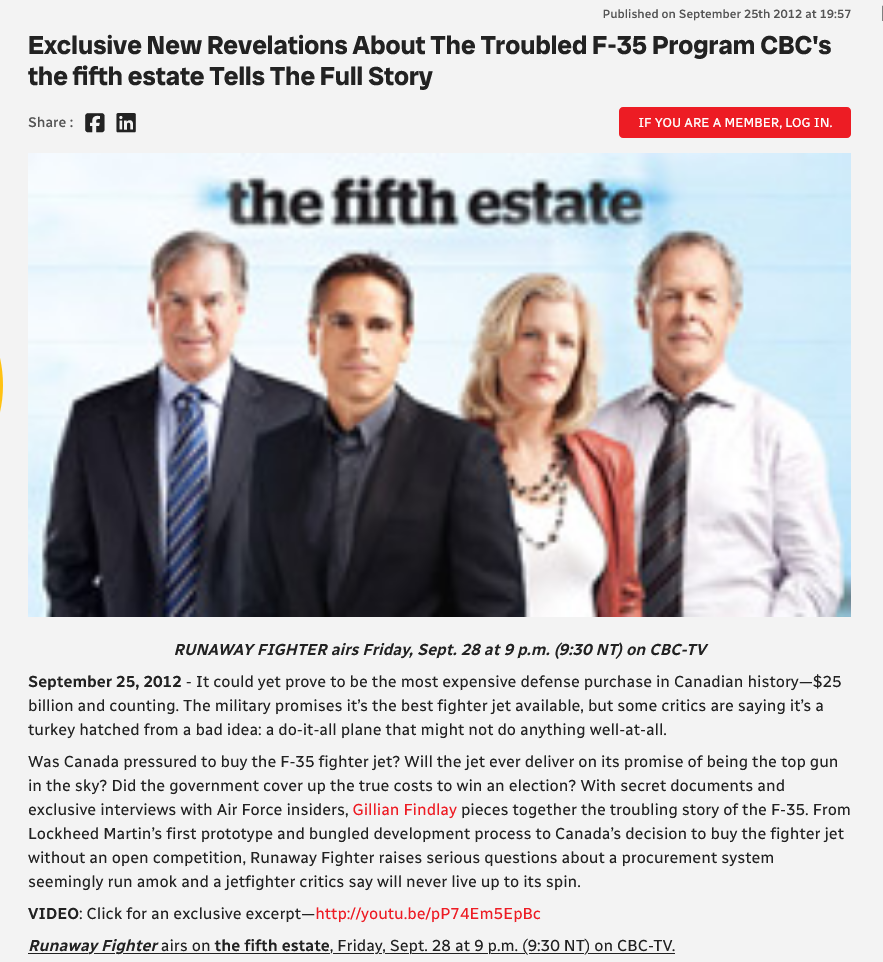 >>64746275>and Israel completely obliterated Iran's airforce and missile force all by themselves within a 12 day air war."And remember for literally years upon years we heard nothing but grief about the F35? Even the venerable Fifth Estate by the CBC got conned by Pierre Sprey in 2012. They were going to any and all media outlets to shit talk the jet, rehashing many arguments they used against the Bradley (and the media learned nothing from that and that these are just con men not whistle blowers). Then these things actually got battle tested and did exactly what they were supposed to do. They're stealth planes and none of the advanced Russian air defenses can even touch them. Then nothing. They literally stopped talking about the F-35 entirely. Sprey also died so that helped. https://mediacentre.cbc.ca/announcement/1576/exclusive-new-revelations-about-the-troubled-f-35-program-cbc-s-the-fifth-estate-tells-the-full-story/