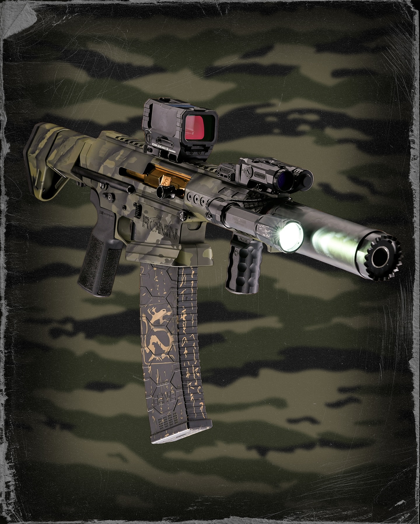 gen 12 shot gun with flechettes and slugsspray painted in tiger stripewith bayonet attached