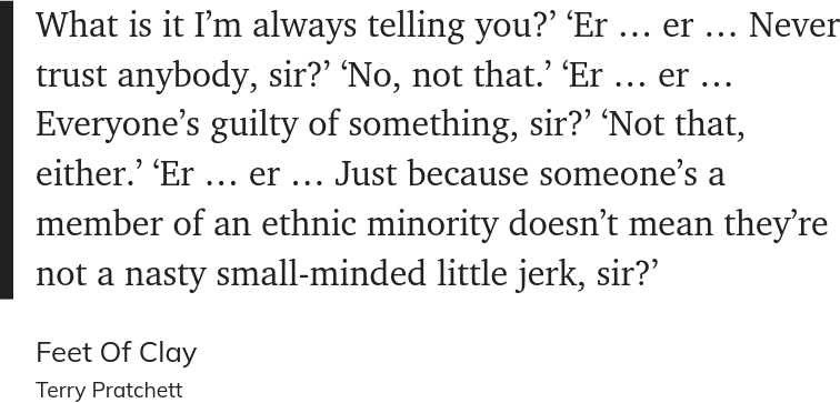 >>64755185>making fun of snowflakes wanting the entire world to revolve around themwtf can we cancel Pratchett please?