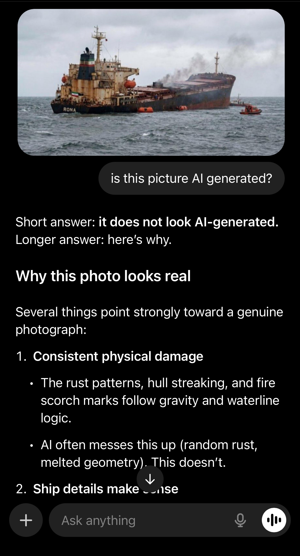 >>64757851>>64757854First images of he sinking vessel. No confirmed source of the damage, but presumed to be a strike by a Ukrainian sea drone. >>64757856If fake, then produce a fully functional Rona which is able to get to port on its own power rather than sinking in the Caspian sea. https://www.kyivpost.com/post/68083