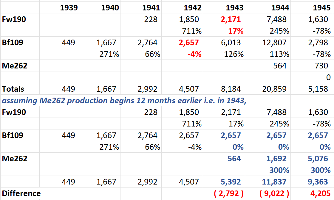 >>64763608according to Adolf Galland, Germany should have halted Bf 109 production, continued Fw 190 production, and allocated the excess to Me 262s.from a fighter pilot POV this made a certain degree of sensebut from a production POV, Adam Tooze has pointed out that this (or any suggestion involving halting Bf 109 production) is pretty stupid, because 1943 was the year that Bf 109 factories were finally hitting their stride and new assembly lines were coming online, despite RAF bombingpicrel illustrates thisthe chart above is actual German WW2 production of the main 3 day fighter typesnote the huge impact on actual Bf 109 and Fw 190 production from RAF bombing. never say that strategic bombing was a failure; it wasn't.now, let's assume that the Me 262 gets more R&D resources, and so could be put into production as soon as the airframe was complete. this assumes that thanks to the additional resources, the retarded single-use-engine problem was unfucked a year before it really was. also, we give a very optimistic 3x annual boost to Me 262 production, representing continued expansion despite Allied bombing.halting Bf 109 production expansion just when it reached optimum efficiency has the net result of slashing Luftwaffe fighter inventory by a full THIRD in 1943, and nearly half in 1944.having 2,200 jet fighters in 1944 would be really nicebut are they worth trading 9,000 Bf 109s for?bear in mind also that at least the Bf 109 is much easier to train new pilots to operate. the Me 262 was notoriously difficult to take off and land in. Galland really only fought with a squadron of aces (with a General as squadron commander and Colonels as flight commanders!) with 1 or 2 thousand kills between them.