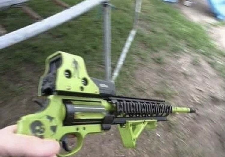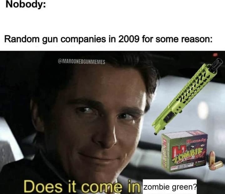 >>64766739BCA makes a .410 AR upper that could be powder coated zombie green amd a green bayo added. Would look good with a lumberjack hard hat and a thong with a chainmail miniskirt.