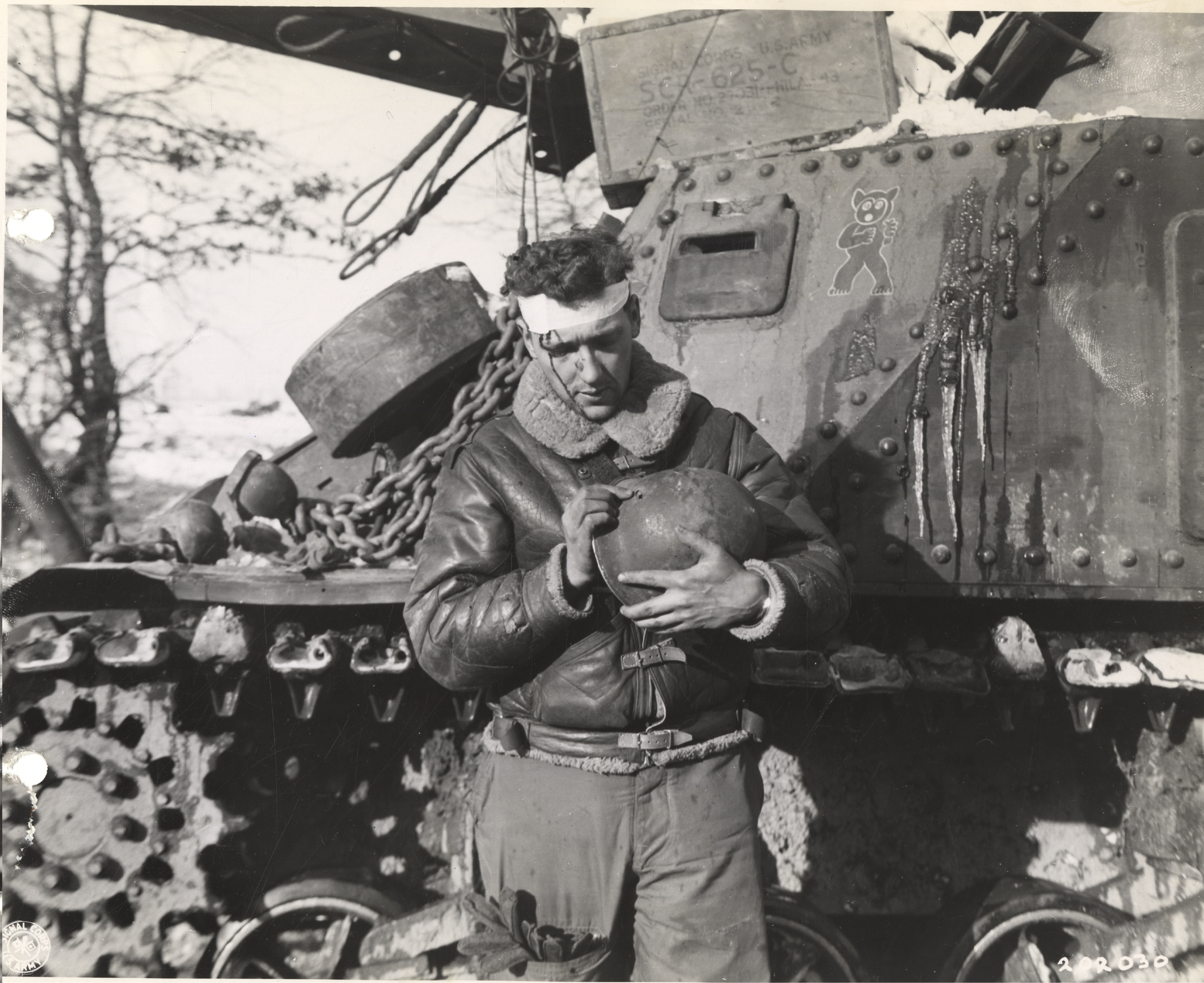 >Signal corp cameraman Harold Roberts points to a hole in his steel helmet, made by enemy shell fragment as he was photographing action of 3rd Armored Division troops in Belgium.
