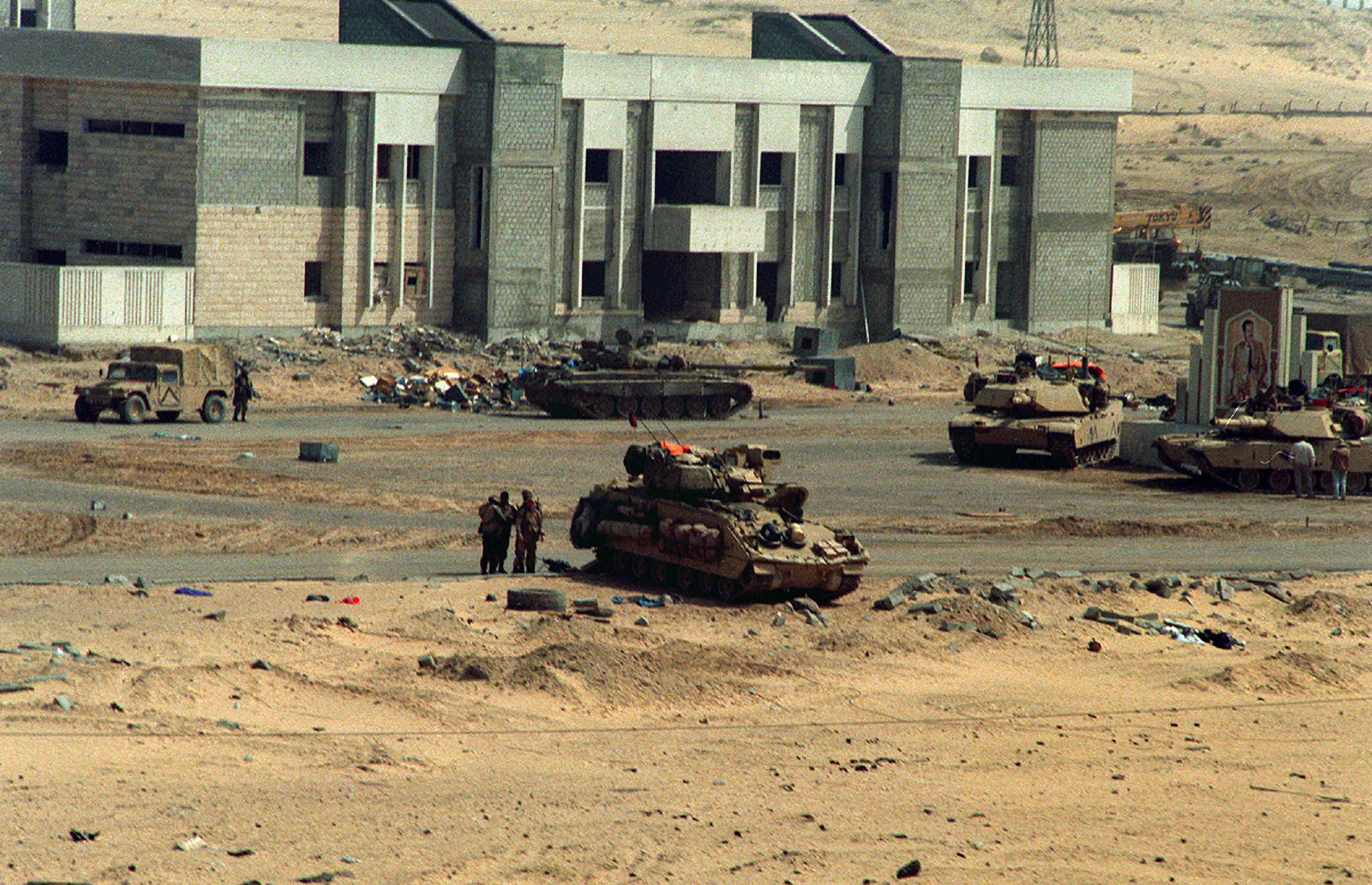 >A pair of Tiger Brigade M-1A1 Abrams main battle tanks and an M-2 Bradley infantry fighting vehicle provide security for the 2nd Marine Division area of responsibility near Al Jahra after the Operation Desert Storm cease-fire. A destroyed Iraqi tank is in the background