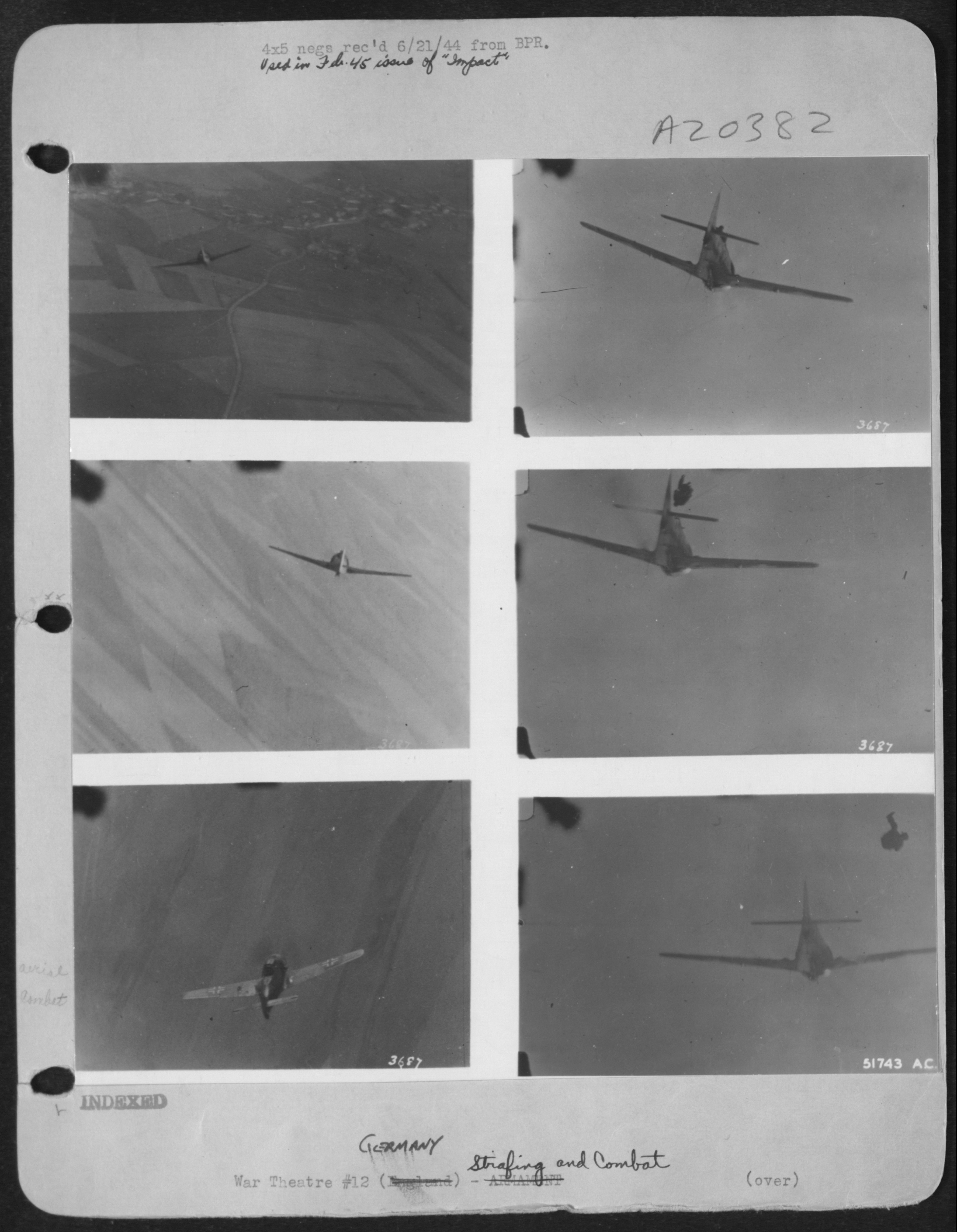 >Graphic view of a German pilot taking to his parachute after losing an aerial duel with an 8th Air Force fighter pilot. The first four views show the Focke Wulf 190 as the American airman closes in on it. The last two views show the Nazi pilot being lifted clear of the plane as he jumps out. Notice the flame bursting from the wing root of the plane, result of strikes from the American guns. These are excerpts from the motion picture gun camera record of the action. On the day these pictures were taken the pilot also knocked down another FW 190. The victorious pilot was Capt. Alvin M. JuchheimAlright you fuckers go find some